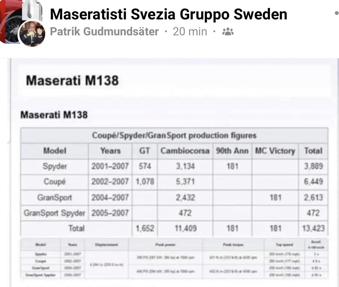 Effectivement il y eu 4795 exemplaires de 3200GT/GTA produits en 3 ans de 1998 à 2001 (moyenne 1598 par an) et donc 13 423 exemplaires de 4200/Spyder/GranSport produits en 6 ans de 2001 à 2007 (moyenne 2237 par an). Il y a eu quand même un accroissement de la production sur la période 2001-2007 d'autant plus que la Quattroporte V eut beaucoup plus de succès que la Quattroporte IV produite jusqu'en 2001. Mais c'est vrai que la 3200 avait déjà sacrément bien relancé les ventes.