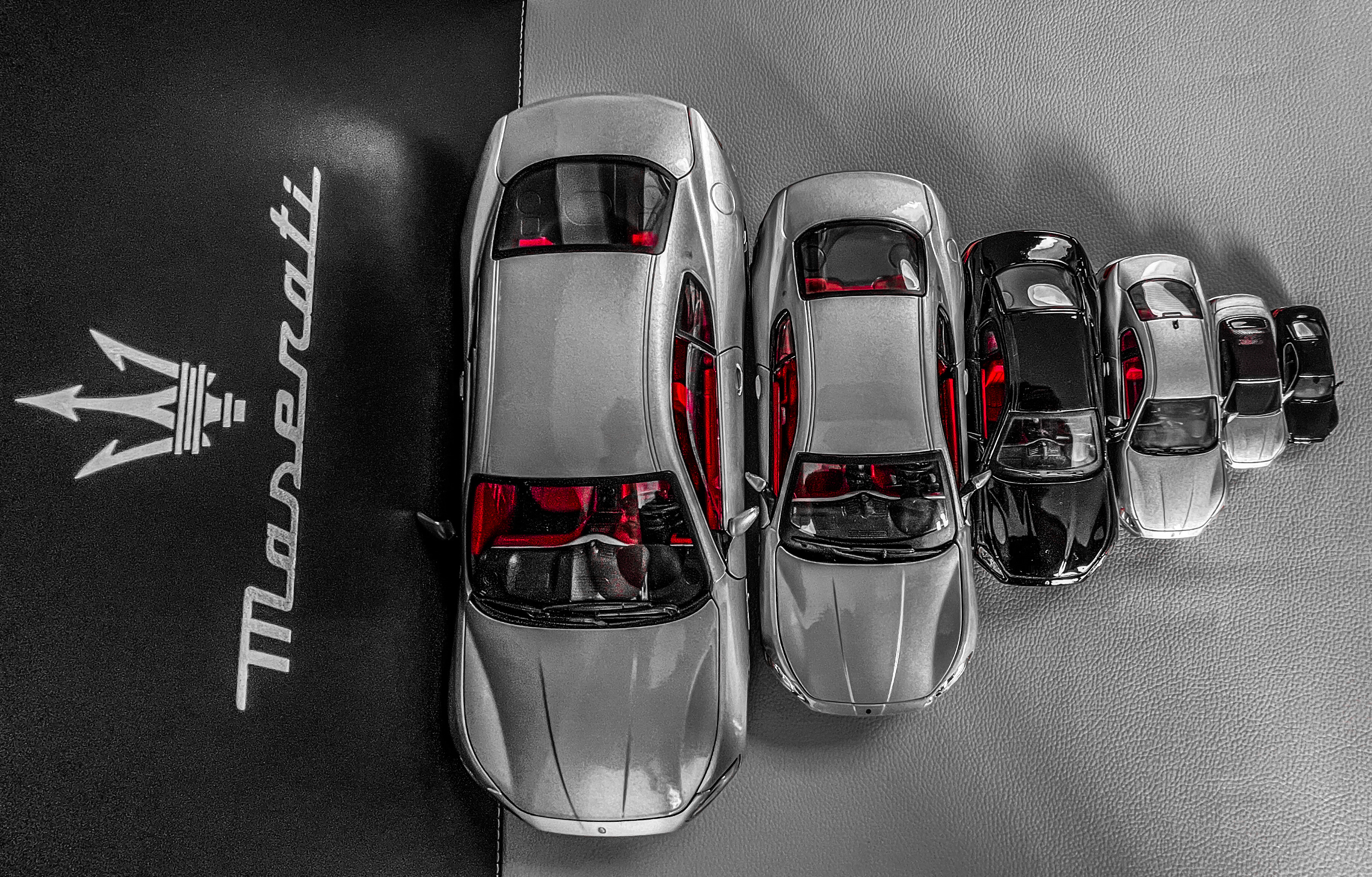 J'ai également débuté une collection 1/64, suite à une opportunité d'acquérir 12 KYOSHO pour une bouchée de pain! J'ai complèté avec un peu de MC20 et de Granturismo et je suis à une vingtaine de modèles. La aussi , j'aitrouvé quelques classiques et Biturbos pour couvrir la période 1957-2000. la aussi, aucun modèle avant cette date.