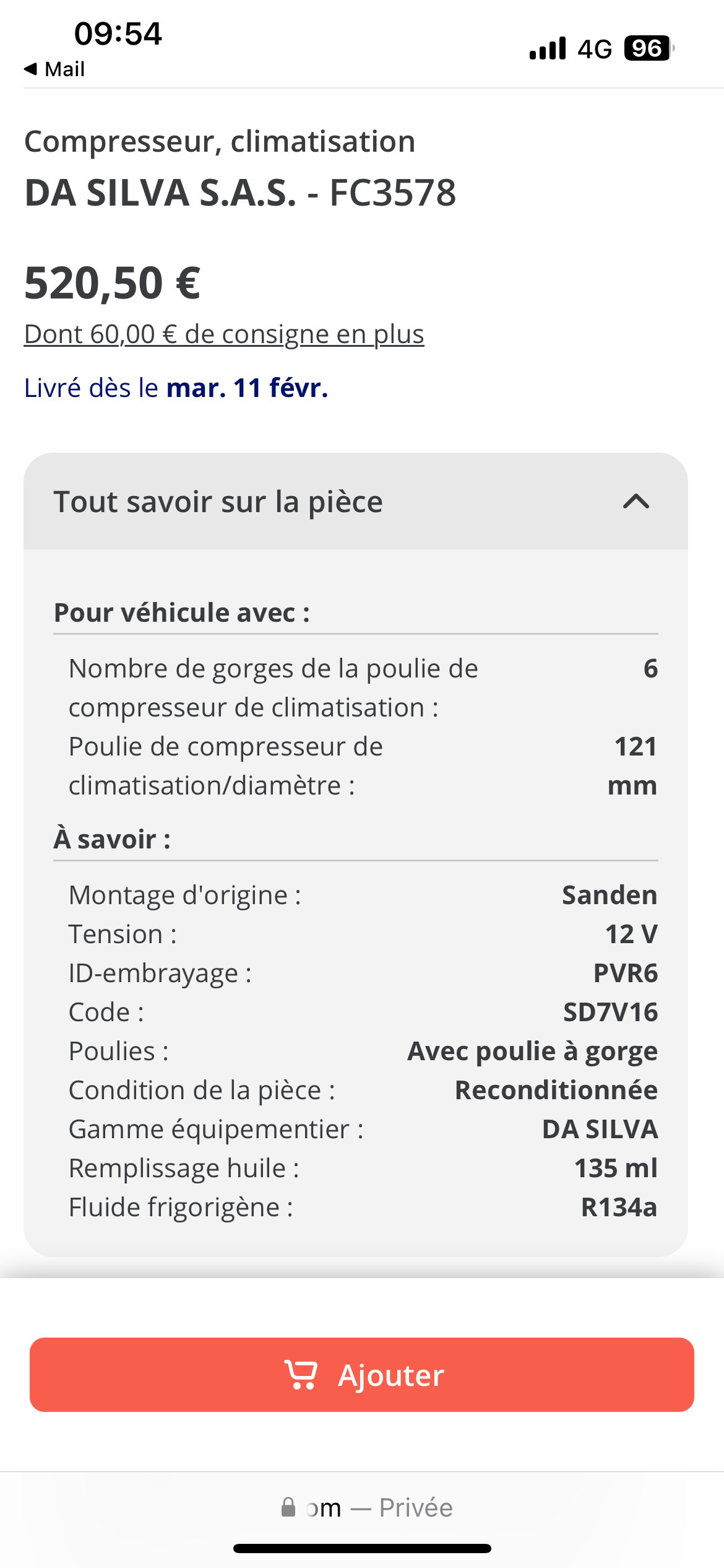 J'ai remplacé mon compresseur en janvier 2018, je l'avais commandé chez KRIOS air Conditiononing en Slovaquie, la référence était 7V16-PV6 et le prix 357.24€ livré