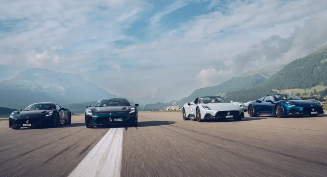 Pour fêter les 110 ans de Maserati, les bolides ont été lâchés sur la piste de l’aéroport de Saint-Moritz. Photo Eugenio Clamer pour Passione Engadina :