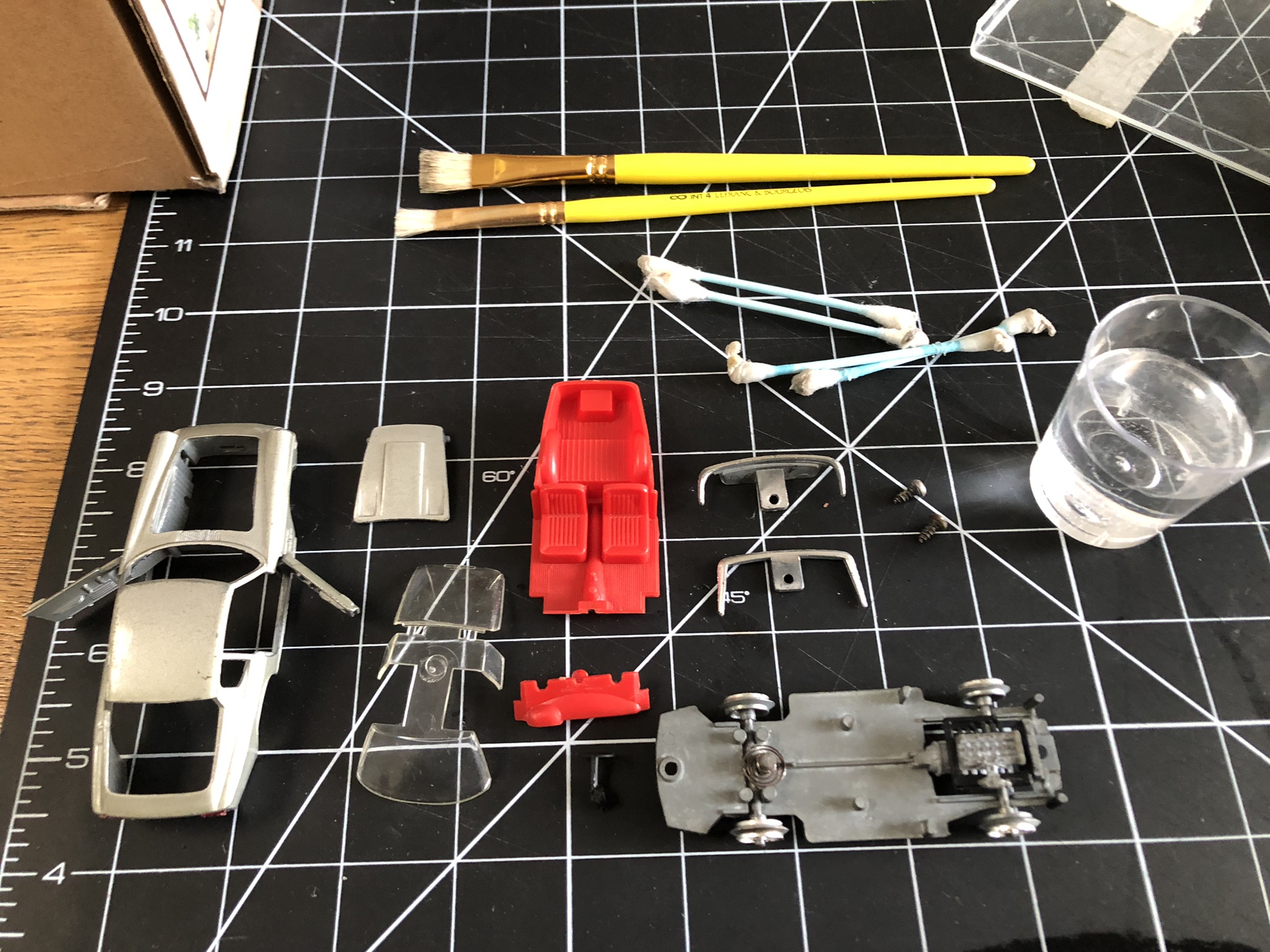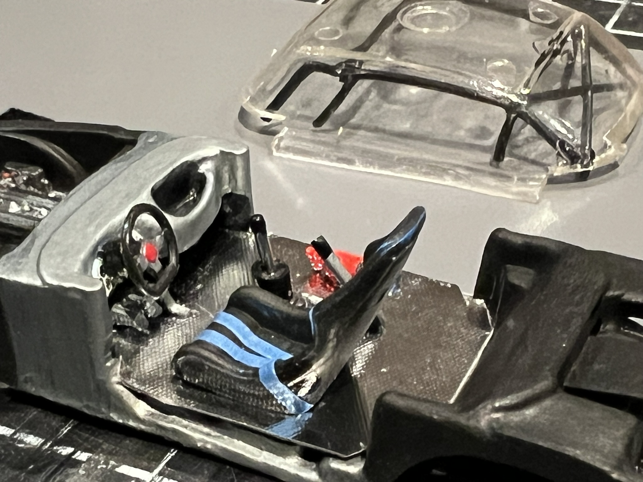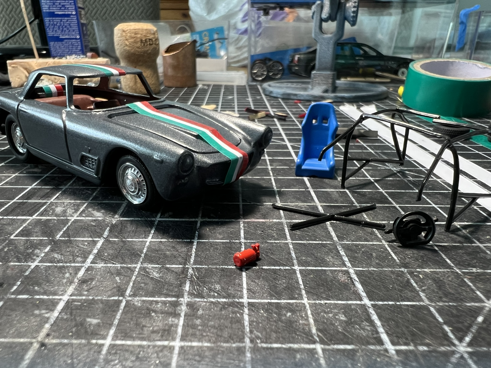 Et je dois ajuster un intérieur complet en mode course : Je prends une 4200GT Trofeo abimée qui donnera arceau, volant, siège et extincteur. Autant le faire avant la finition peinture.