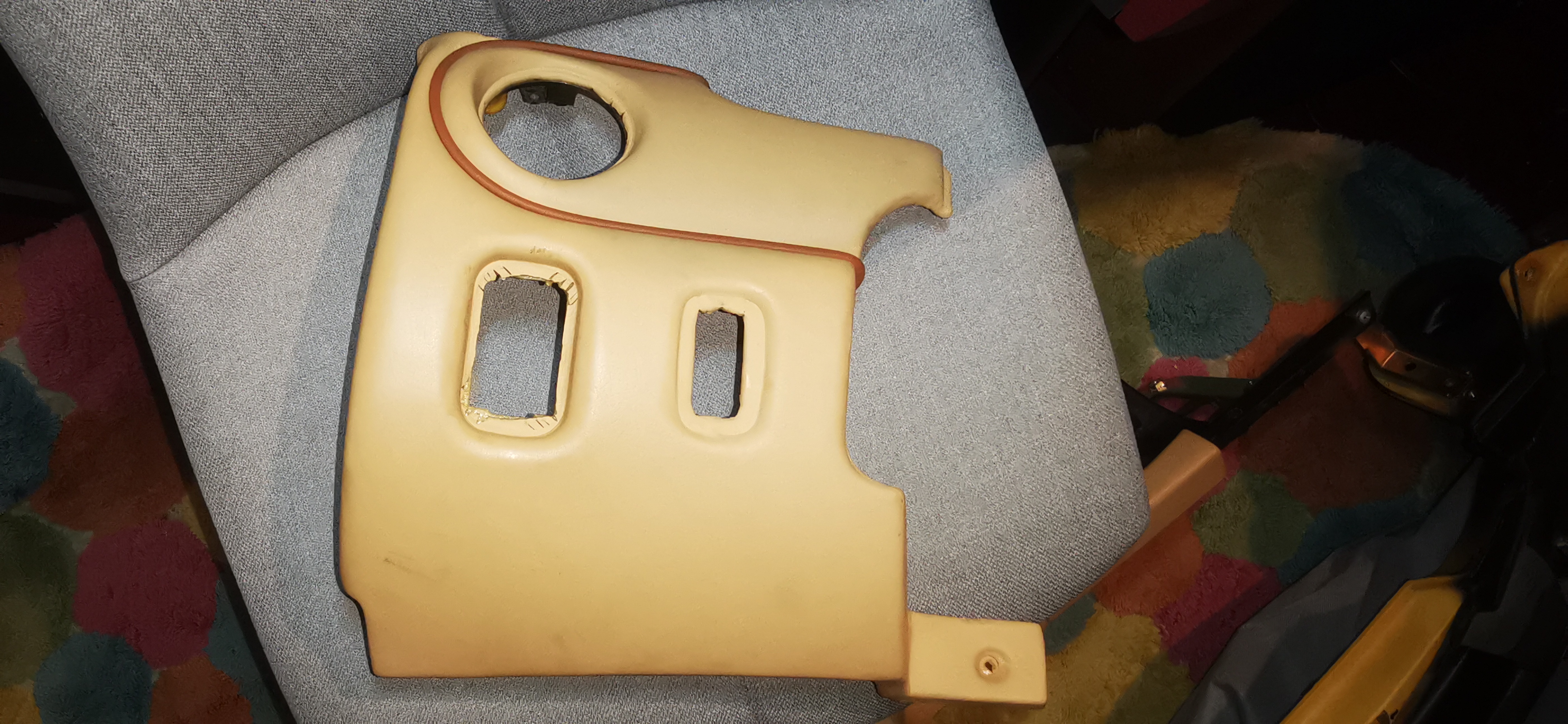 La tache à été un peu plus complexe que prévus, j'ai du séparer une partie du tableau de bord côté volant pour pouvoir passer les commodos sans les retirer. Pourquoi je vous parle du pommeau de vitesse, parce qu'il est venu forcer sur l'envers des boutons de réglage de chaleur et a éclaté toute la coque en plastique qui soit dis en passant est plus fragile que du cristal ! :x