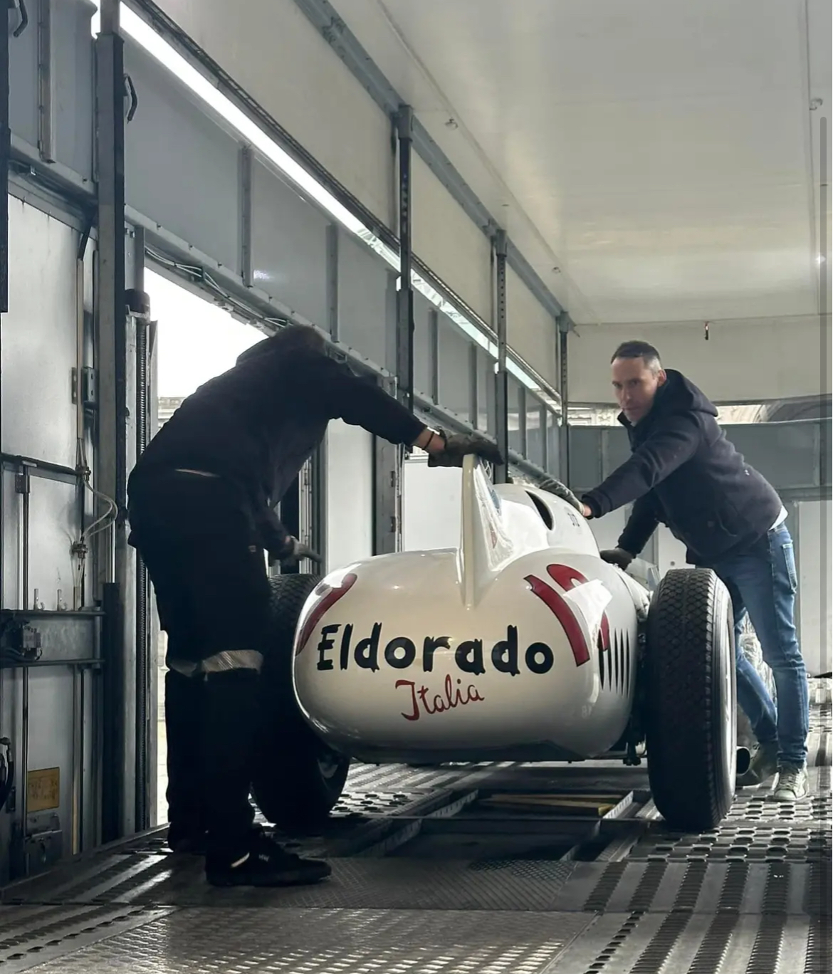 La très précieuse cargaison est bien arrivée à Autoworld Brussels . Matteo Panini participe au déchargement de l’Eldorado :