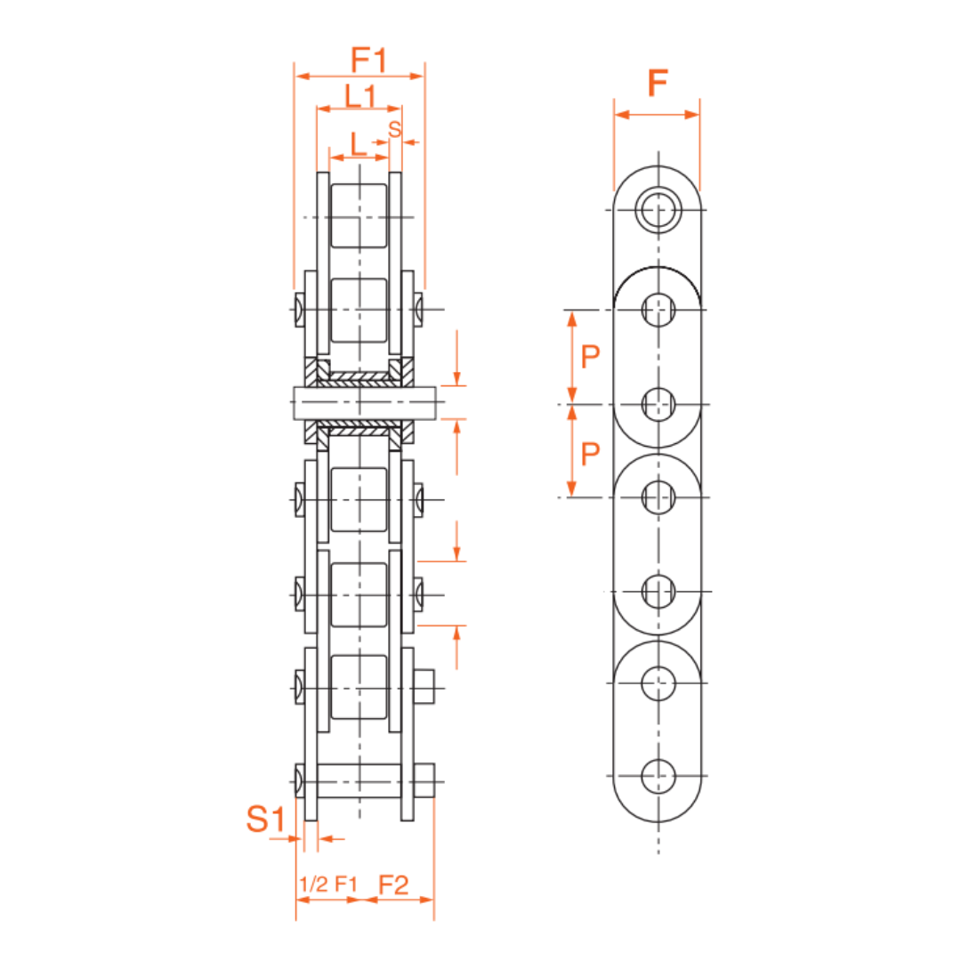 Les dimensions ne correspondent à aucun standard de chaînes à rouleaux. D'ailleurs il semblerait que ce soit plutôt une chaîne à douilles (bushed chain) si j'ai bien compris la différence c'est que le rouleau est libre entre les plaques tandis que la douille est plus ou moins sertie dans les plaques intérieures. Ca semble être couramment utilisé pour, comme par hasard, les chaînes de distribution.