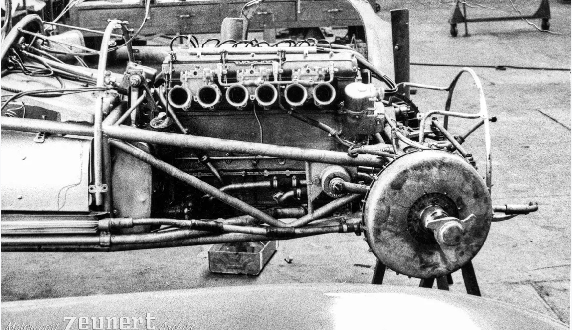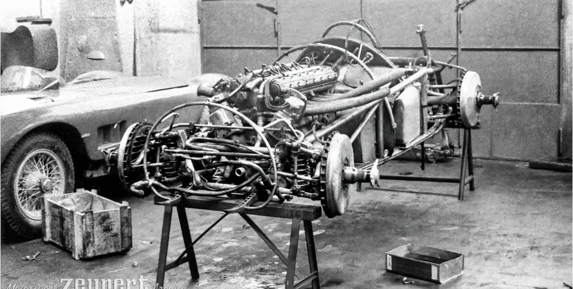 Encore une photo de 250F dénudée prise en mars 1956 à l’usine Maserati de Modène par Charlie Dean :