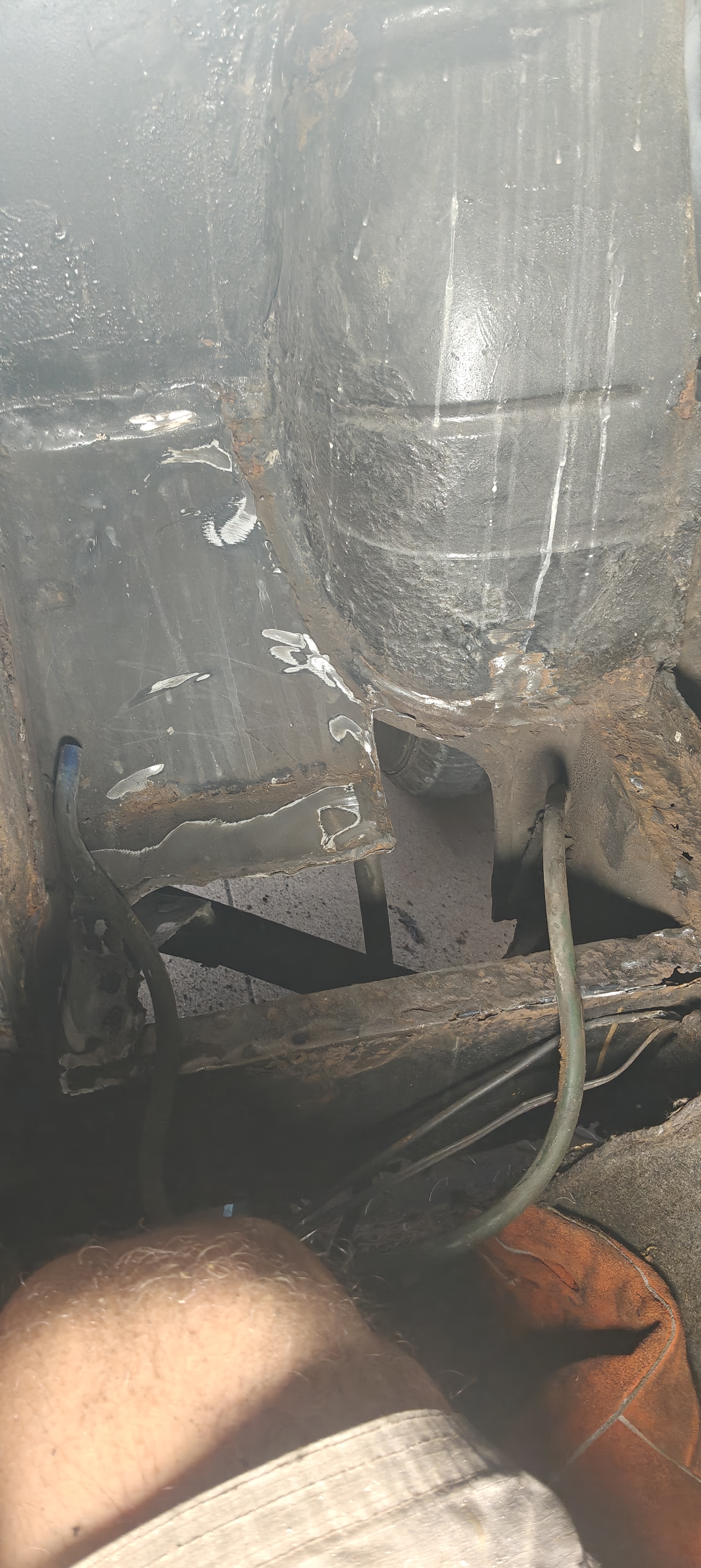 Pas de surprise, la partie inférieure au pied du réservoir est toute rouillée, burin, meuleuse et autres pour enlever toutes les parties malades (oui, c'est le sol du garage que l'on voit depuis l'habitacle