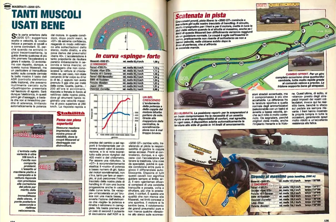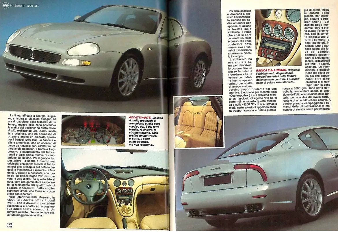 Pour les italianophones, un essai de la 3200GT dans la revue Quattroruote d’octobre 1998 (cliquez sur les images pour mieux lire le texte):