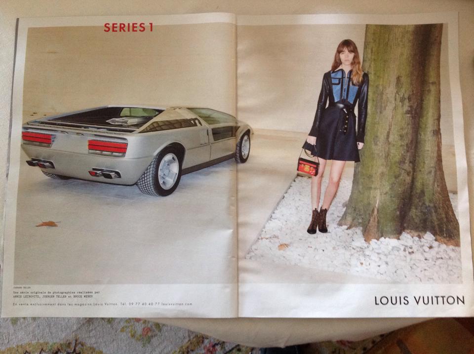 Quelle ne fut pas ma surprise de retrouver la Boomerang, concept car unique des seventies, servant de fond publicitaire pour les sacs Vuitton !