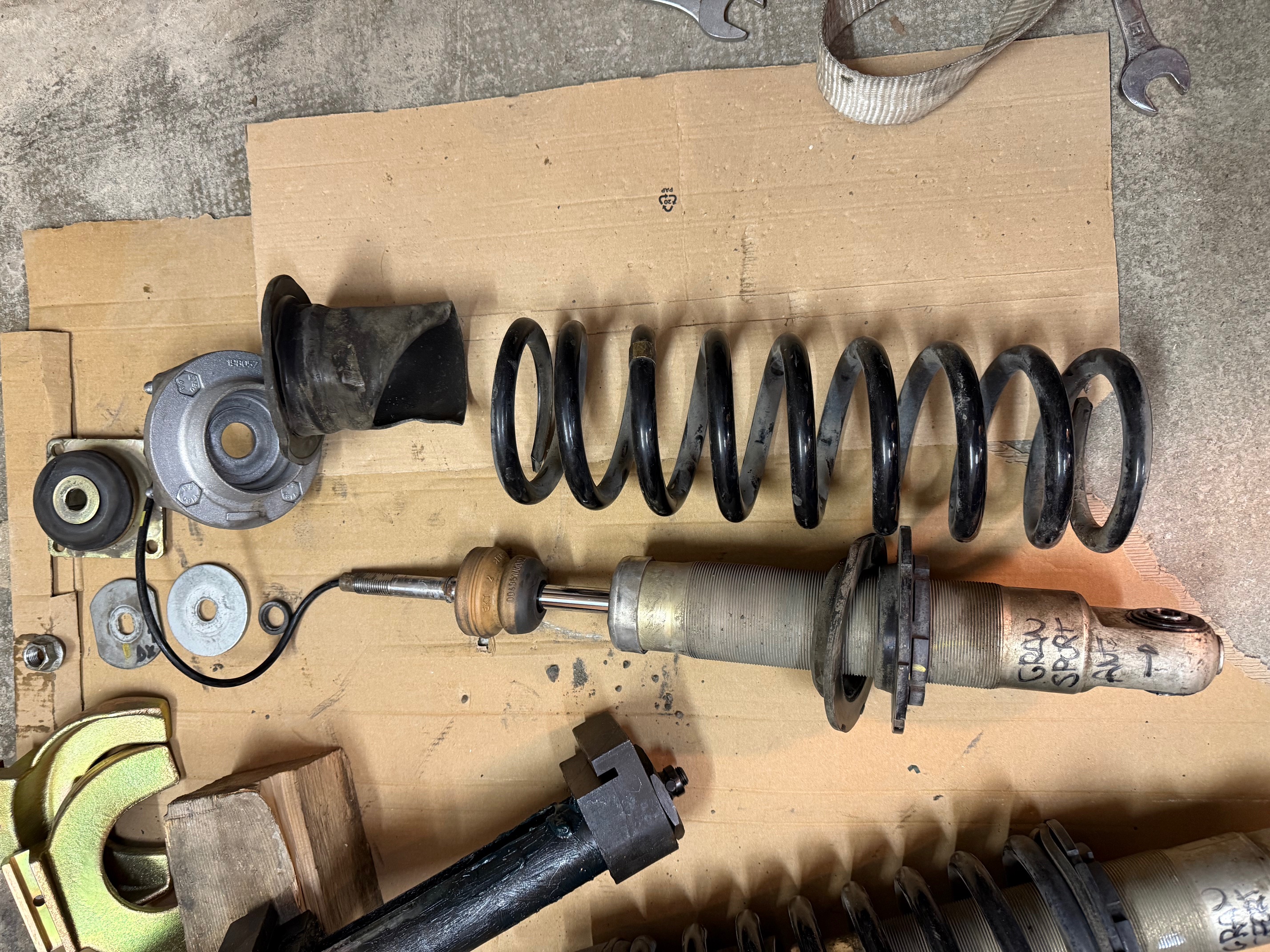 4 vis de 13 qui tiennent les coupelle et une grande au bas de la suspension. On change les silent bloc je l'ai pas dis mais il faut une presse hydraulique