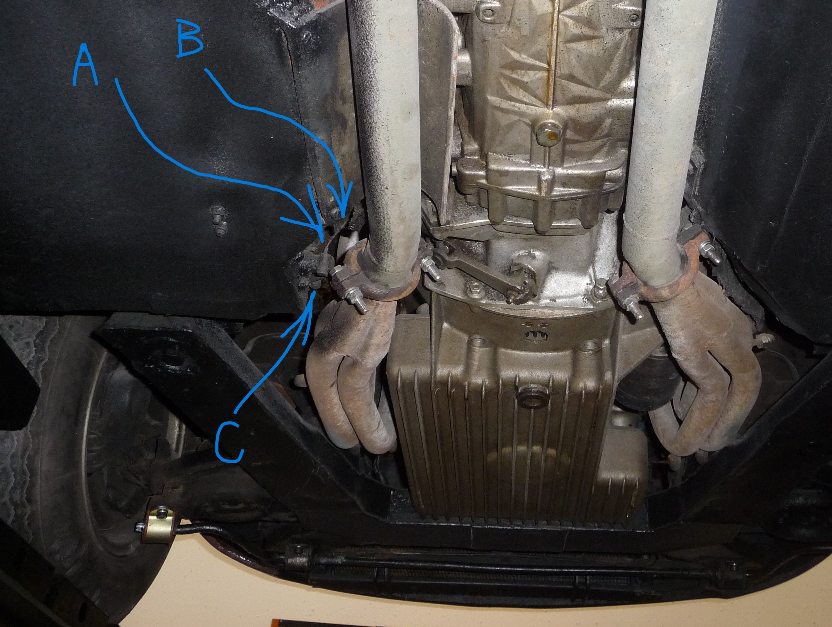 Ci-dessous, deux photos des dessous prises chez Valenti à l'époque de la restauration, montrant l'axe du mécanisme d'actionnement du câble en A et le départ du câble en B.