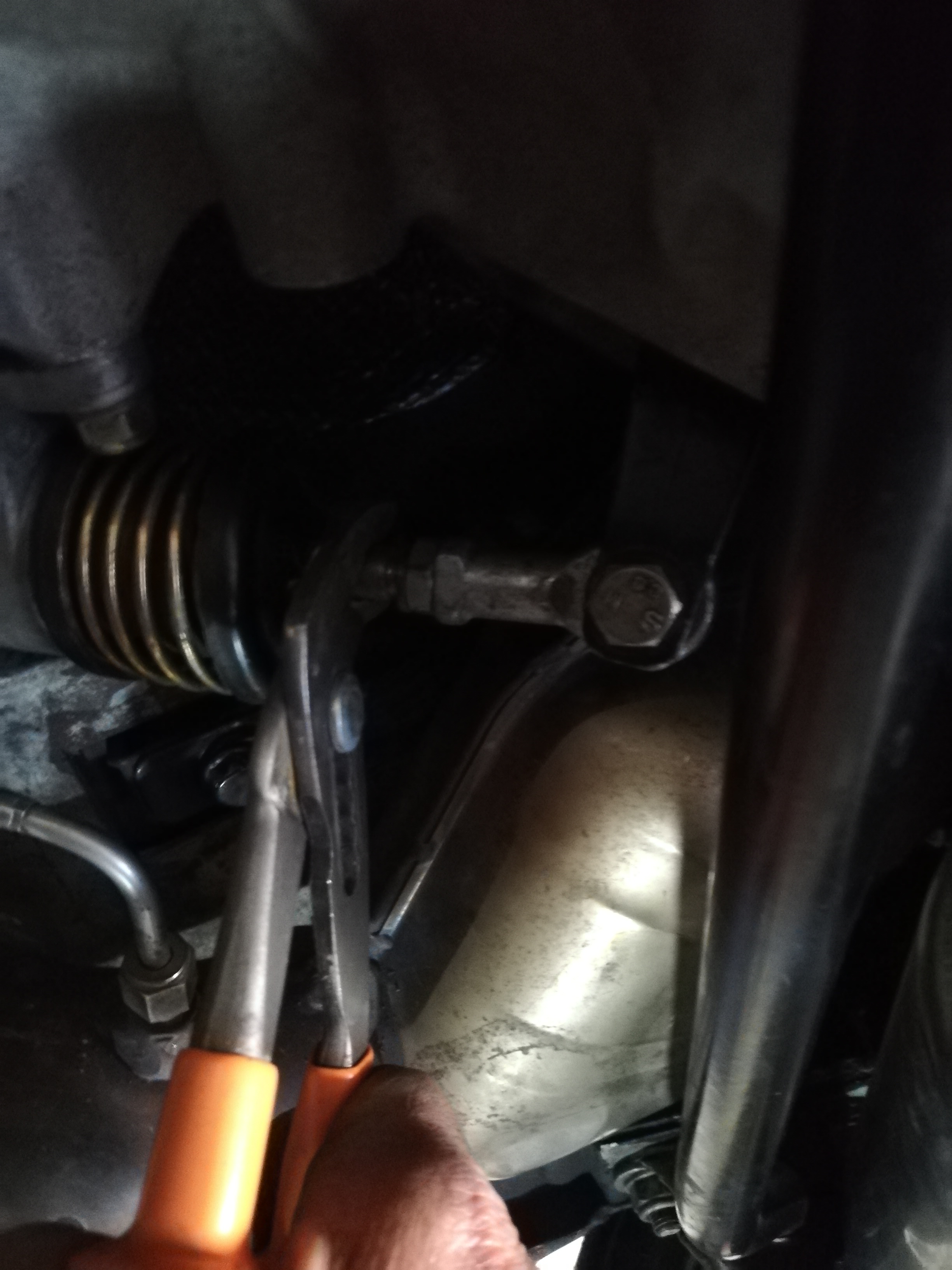 Vissage de la tige du récepteur d'embrayage au maximum (noter le nombre de tours) et désaccouplement de la fourchette. Si la fourchette est libre pas besoin de la désaccoupler, dans mon cas c'était nécessaire. Il est peut-être possible de désaccoupler sans toucher au réglage, à vous de voir.