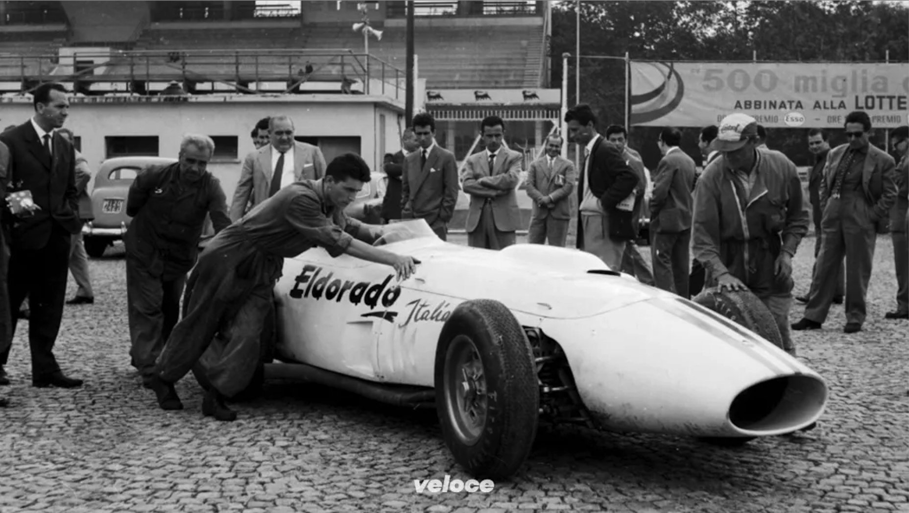 Ciao CBi, ça semble être la 420 M58 Eldorado en cours de gestation. La prise d’air pour les carbu est encore très fine et centrale et il n’y a pas encore de dérive . Il est vrai que c’était le V8 de 4.2 litres placé dans une 250F. Le pilote pouvait être assis assez bas car l’arbre de transmission passait à sa gauche. Le pilote casqué de blanc pourrait bien être Stirling Moss.