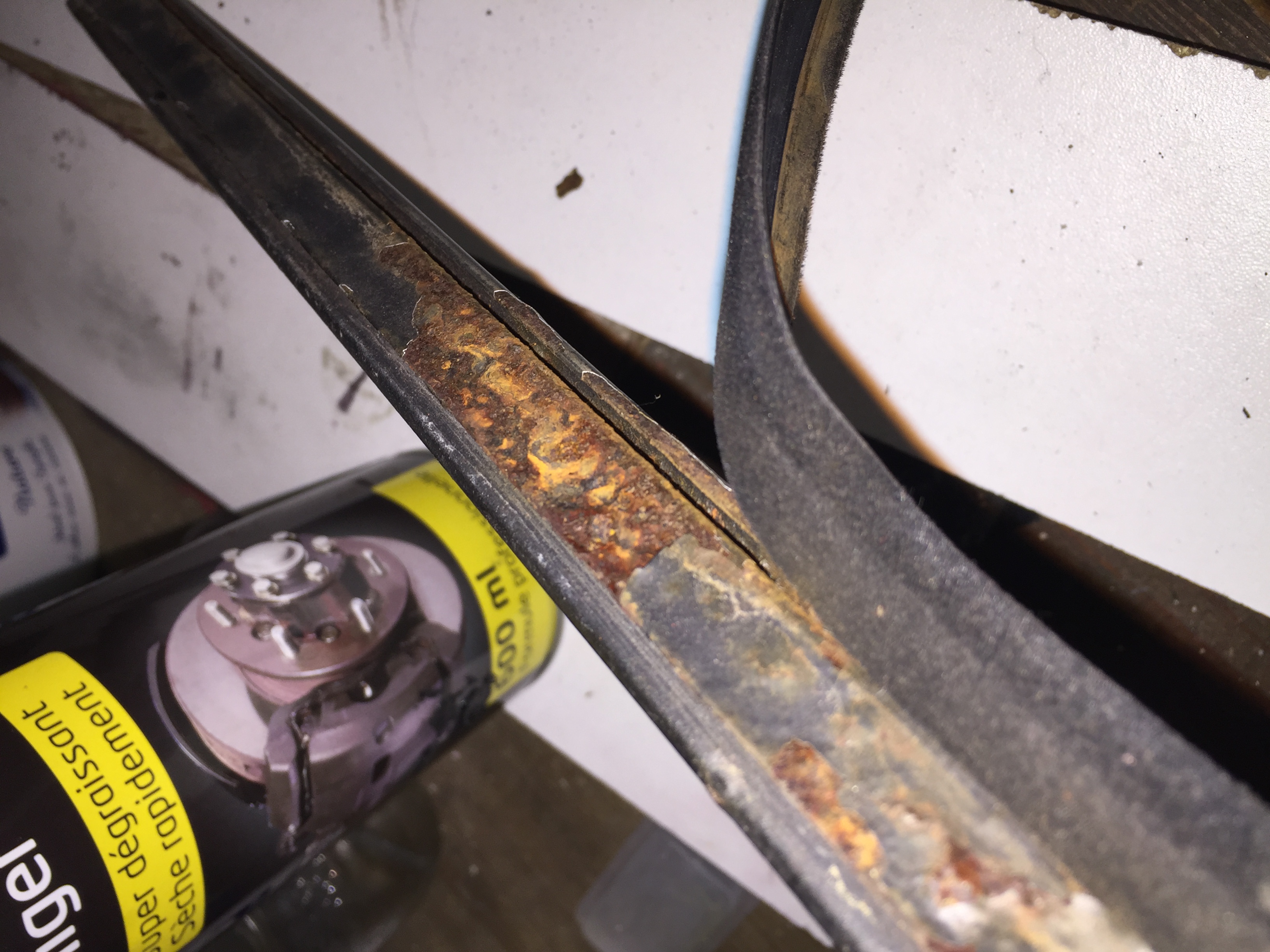 Je constate aussi Quelques petites cloques sur le cache en plastique... donc je devise et je meule.... ces @#&€**—@ de rivets ( c est pas un peu cretin de fixer en bas avec une vis cruciforme et des rivets à l interieur) et la je constate qu a l angle il y a aussi quelques petites cloques. Donc je les usines....
