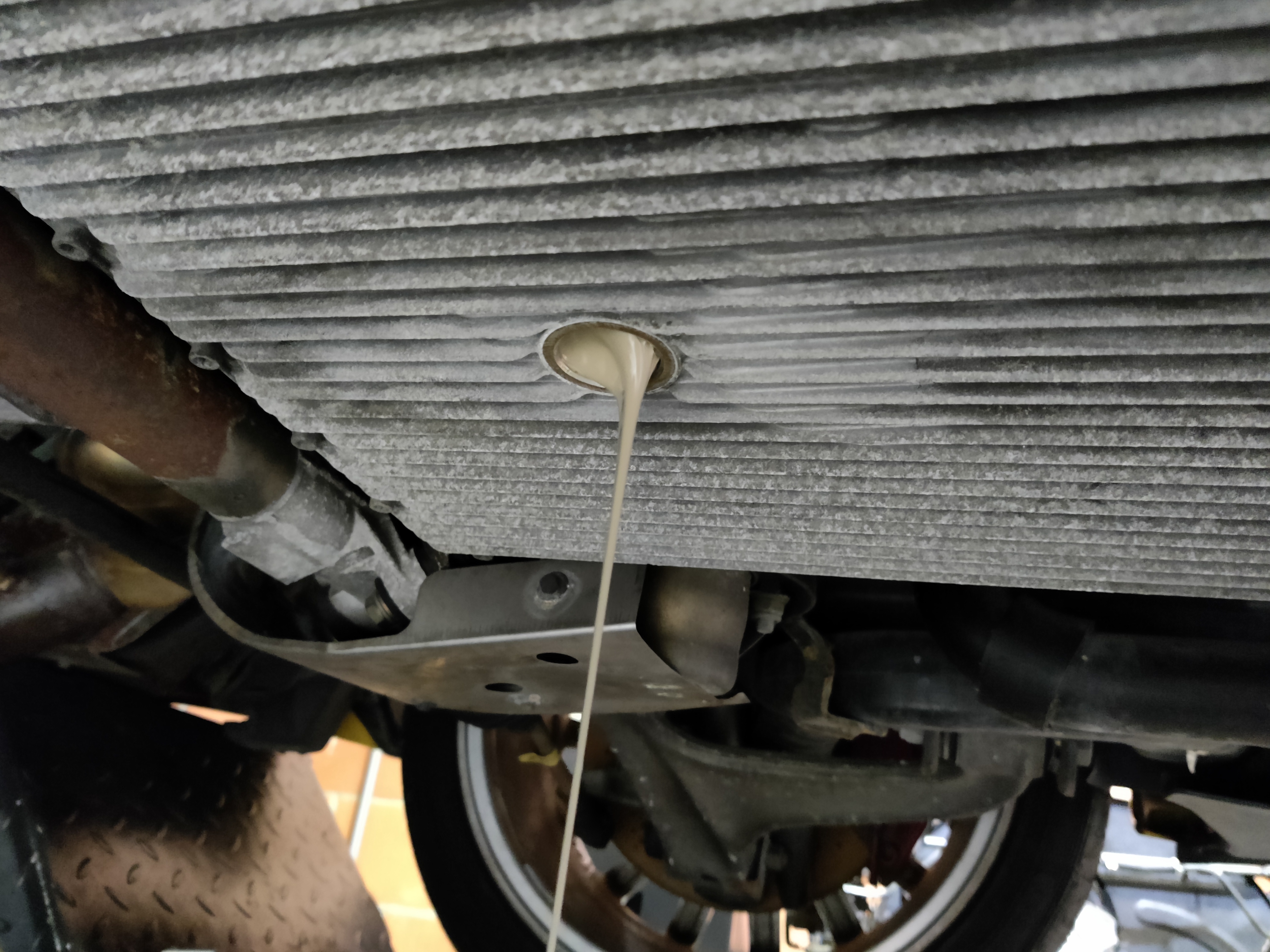 Alors, tout d'abord, en vérifiant le niveau d'huile, on se trouve un bon 8cm au dessus de la jauge (oui, il y a de l'huile jusqu'à l'extrême droite de la photo, pas de mayo pourtant.