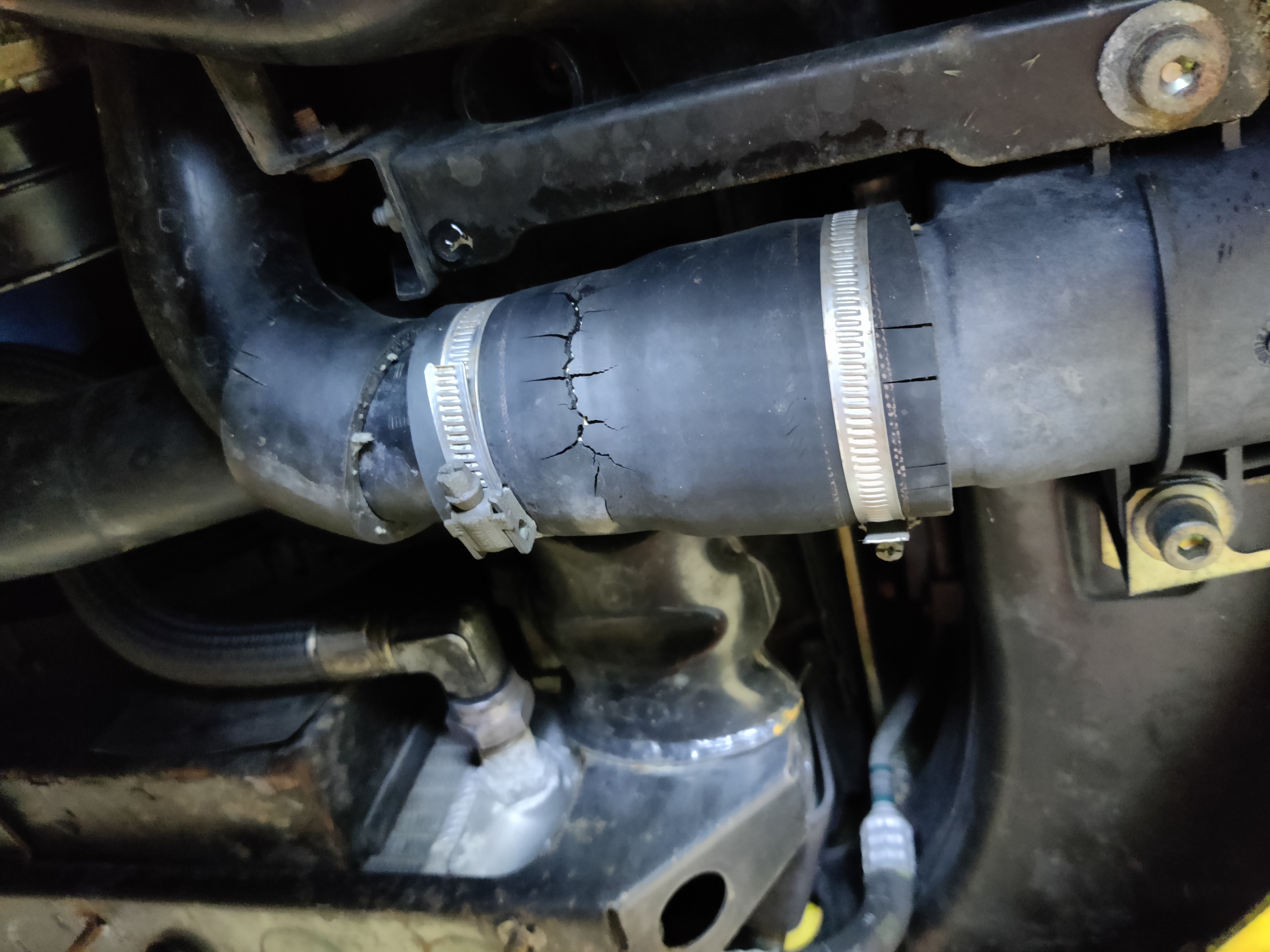 Ensuite, les durites de l'intercooler. Une fois encore (comme à chaque fois j'ai envie de dire, 3ème 3200, 3ème avec les durites HS, je vous l'ai dit, prenez 10 minutes à regarder, il n'y a qu'une dizaine de vis à enlever, et il y a toutes les chances que les votres soient aussi fendues).