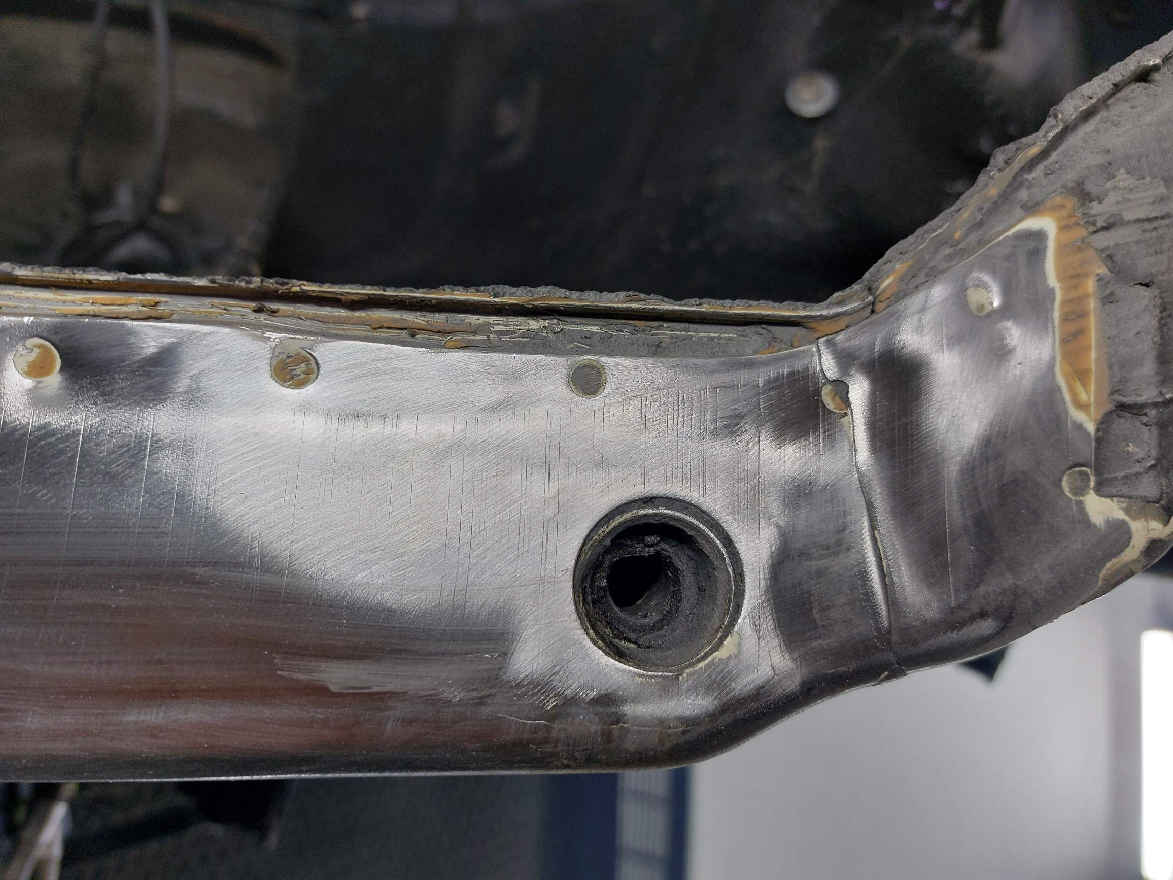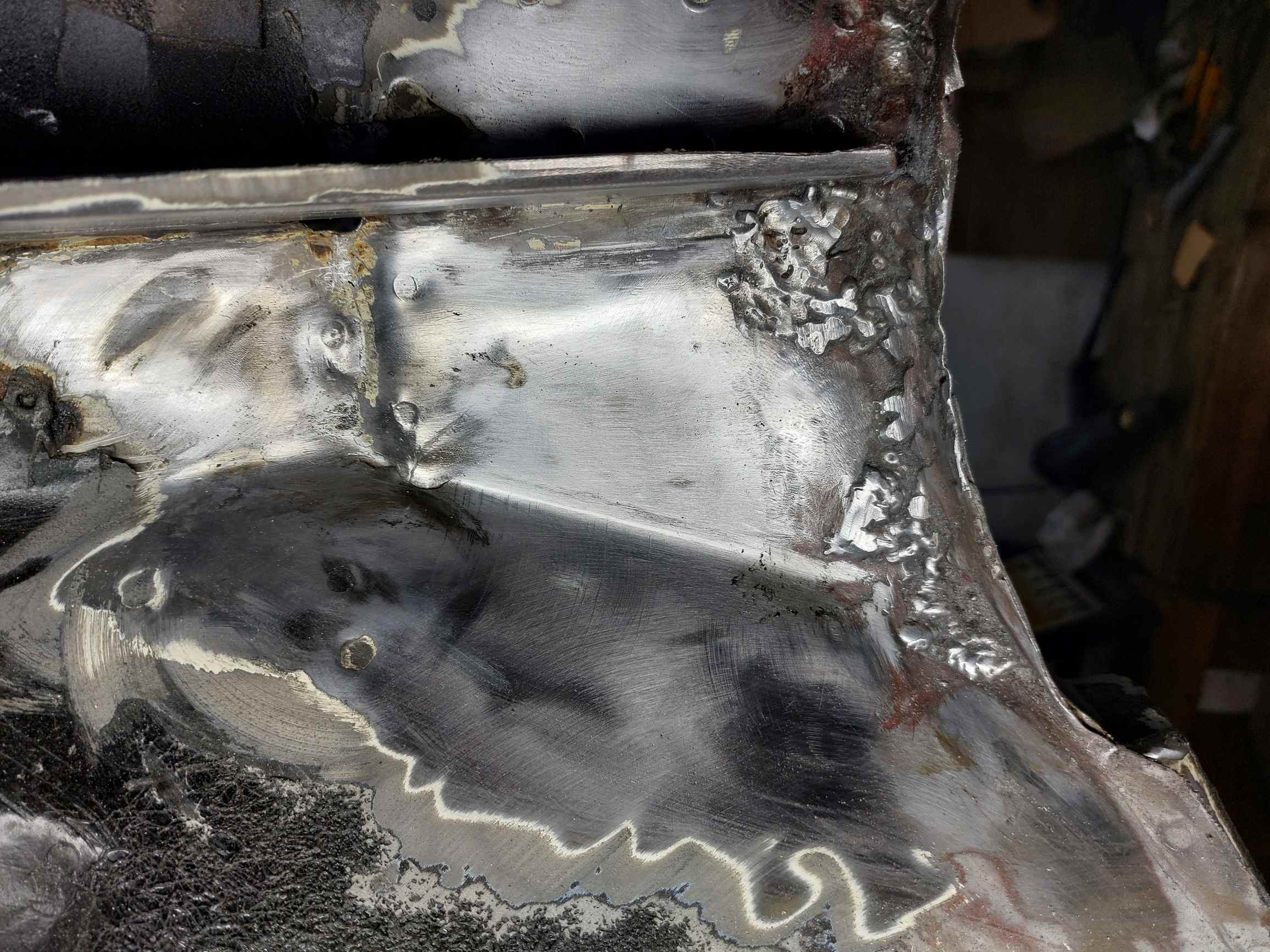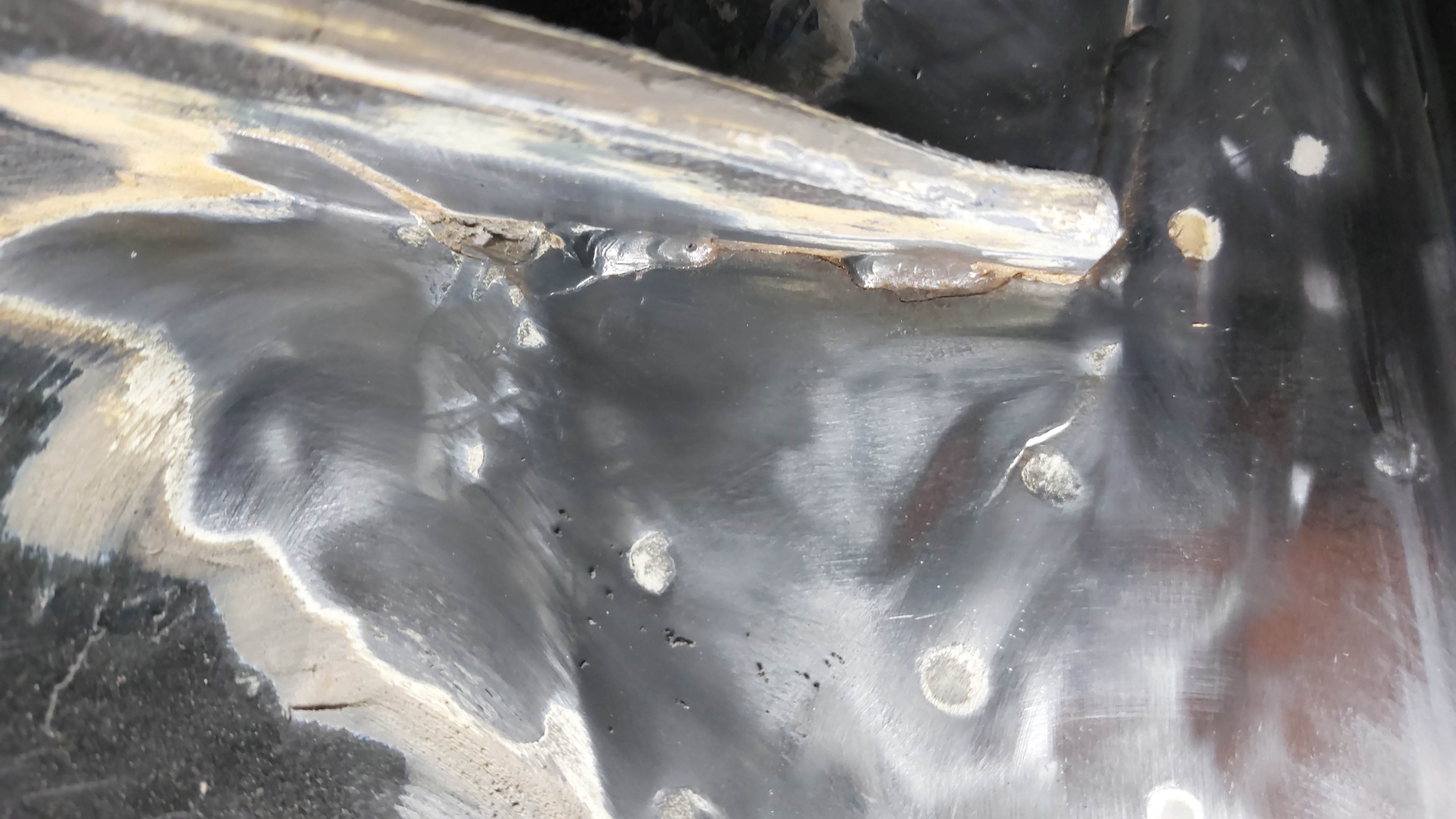 Voilà la ghibli, longeron ouvert côté pieds du passager. Je ne sais pas pourquoi le forum retourne la photo de 90 degrés. C'est tout moche dans la courbe au fond parce qu'ils avaient soudé des gros pâtés là ou en général la parois qui tourne se découd du bas.