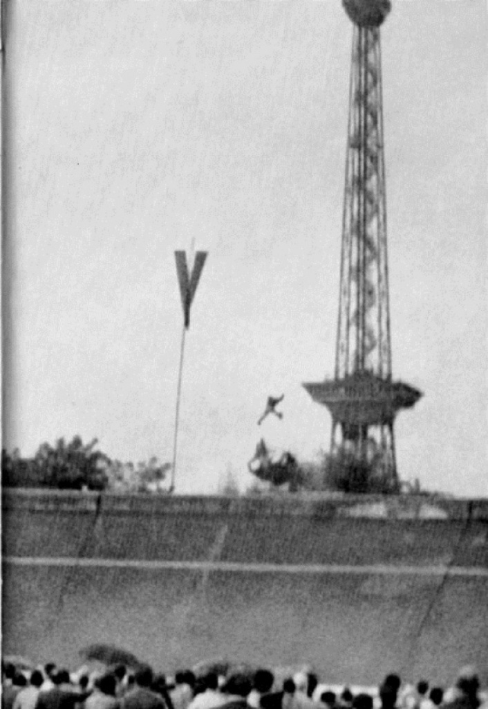 Cette photo est impressionnante : on voit le corps de Jean Behra un quart de seconde avant l'impact fatal contre le poteau à gauche. La voiture s'écrasa par l'arrière sur un ancien socle en béton de DCA. J'ai vu des photos de l'épave, le cockpit n'était pas déformé. Si Jean Behra avait été attaché, il ne serait peut-être pas mort ce jour là