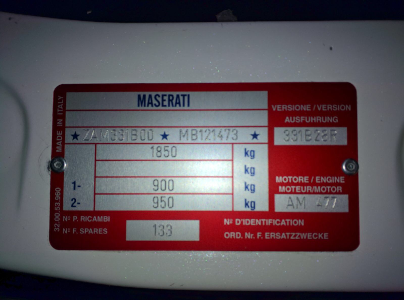 Si la voiture provenait neuve de l'importateur belge, il est plus probable que le n°de PVA (n°d'homologation en Belgique) aurait été ajouté sur la plaquette d'origine dans la case du haut, ou sur une autre plaquette ajoutée avec le logo Maserati et les inscriptions faites proprement avec des poinçons.