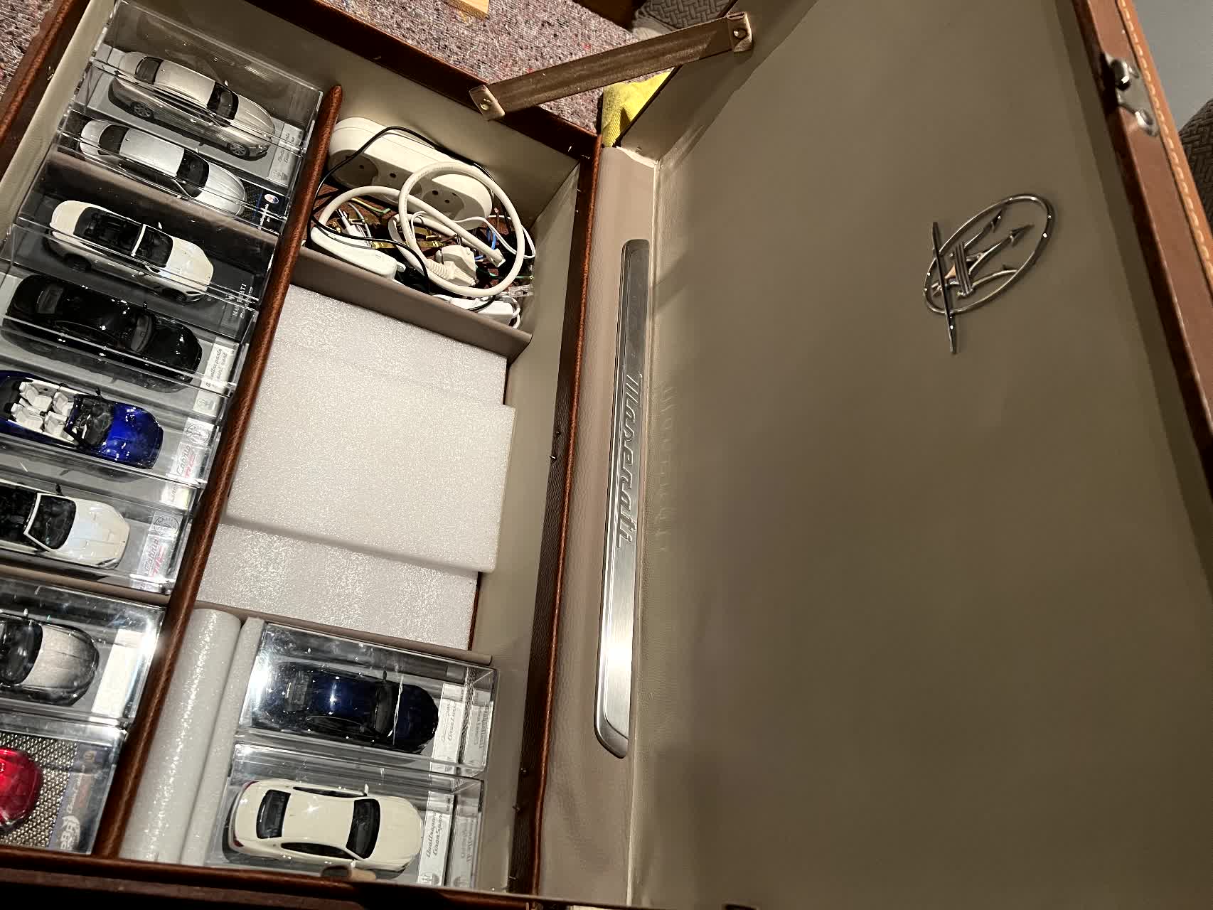 Je me suis livré à un petit calcul = une voiture miniature 1/43 dans sa boîte, c'est environ 730cm3, soit 0,73 litres. Pour loger les plus de 380 Maserati du musée, à supposer que les dimensions des valises tombent juste sans perte de place, il faudra donc de l'ordre de 9 valises taille "cabine" de 31 litres