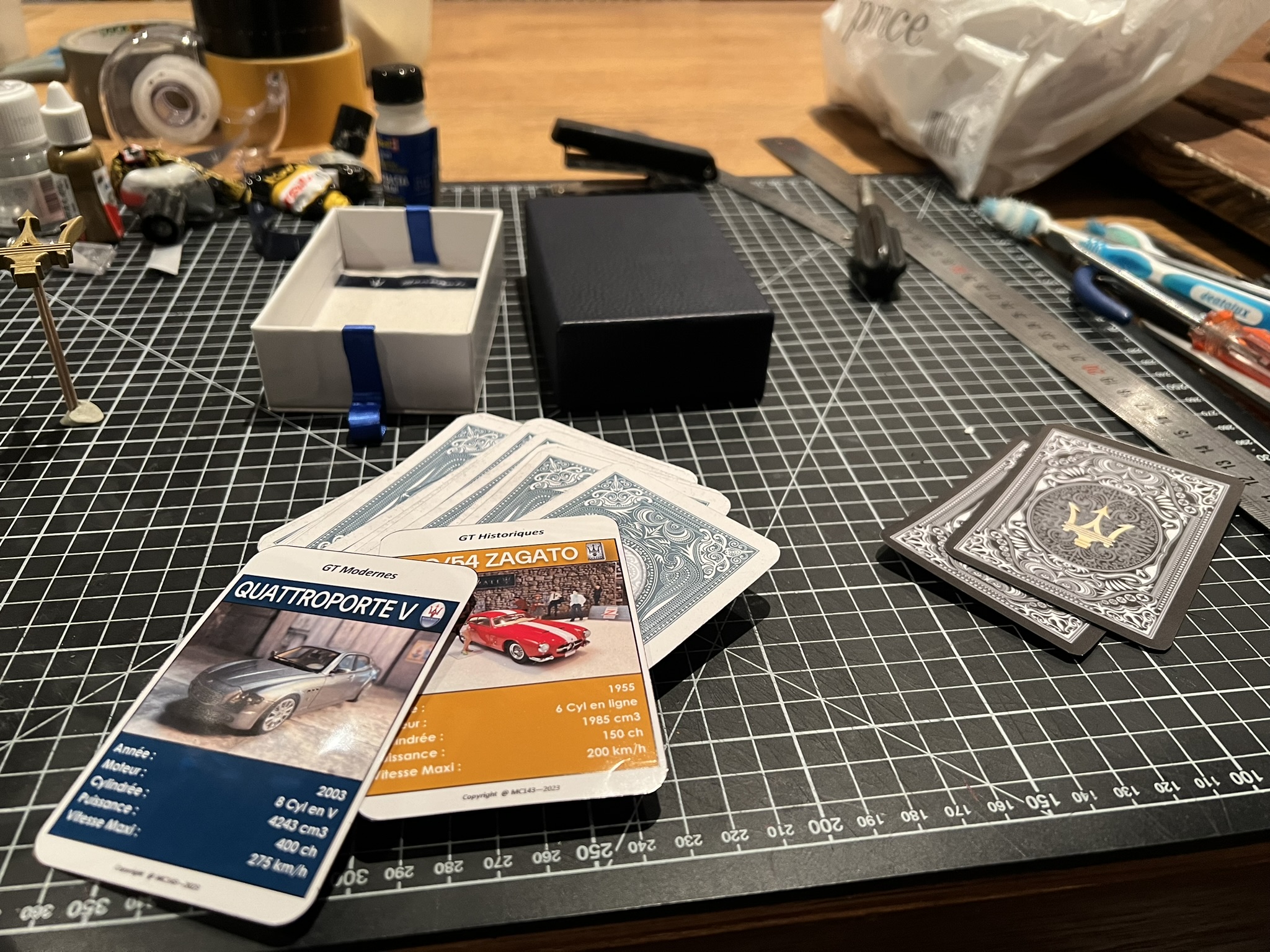 Du coup je l'ai ressorti et suis allé au bout du truc, avec 7 familles de 6 autos et 4 carte atouts. J'ai crée, imprimé coupé les cartes et j'ai fait une jolie boîte pour emballer le tout.