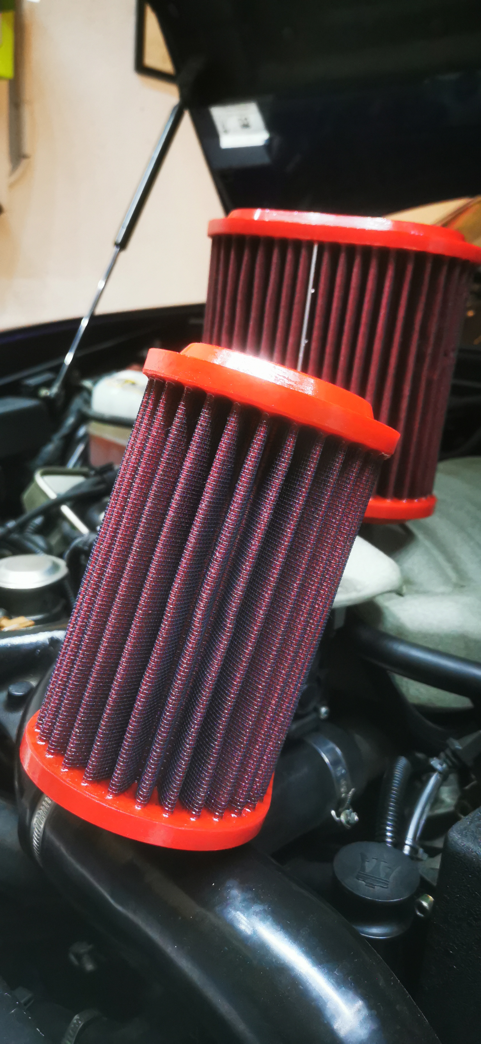 Aujourd'hui, enfin depuis 1 semaine, service des filtres à air de la 3200. Opération simple de nettoyage et rehuilage. Comme j avais un peu trop chargé en huile ils sont restés à égoutter toute la semaine en changeant les couches régulièrement. Les voilà comme neufs pour les prochains 20 000.
