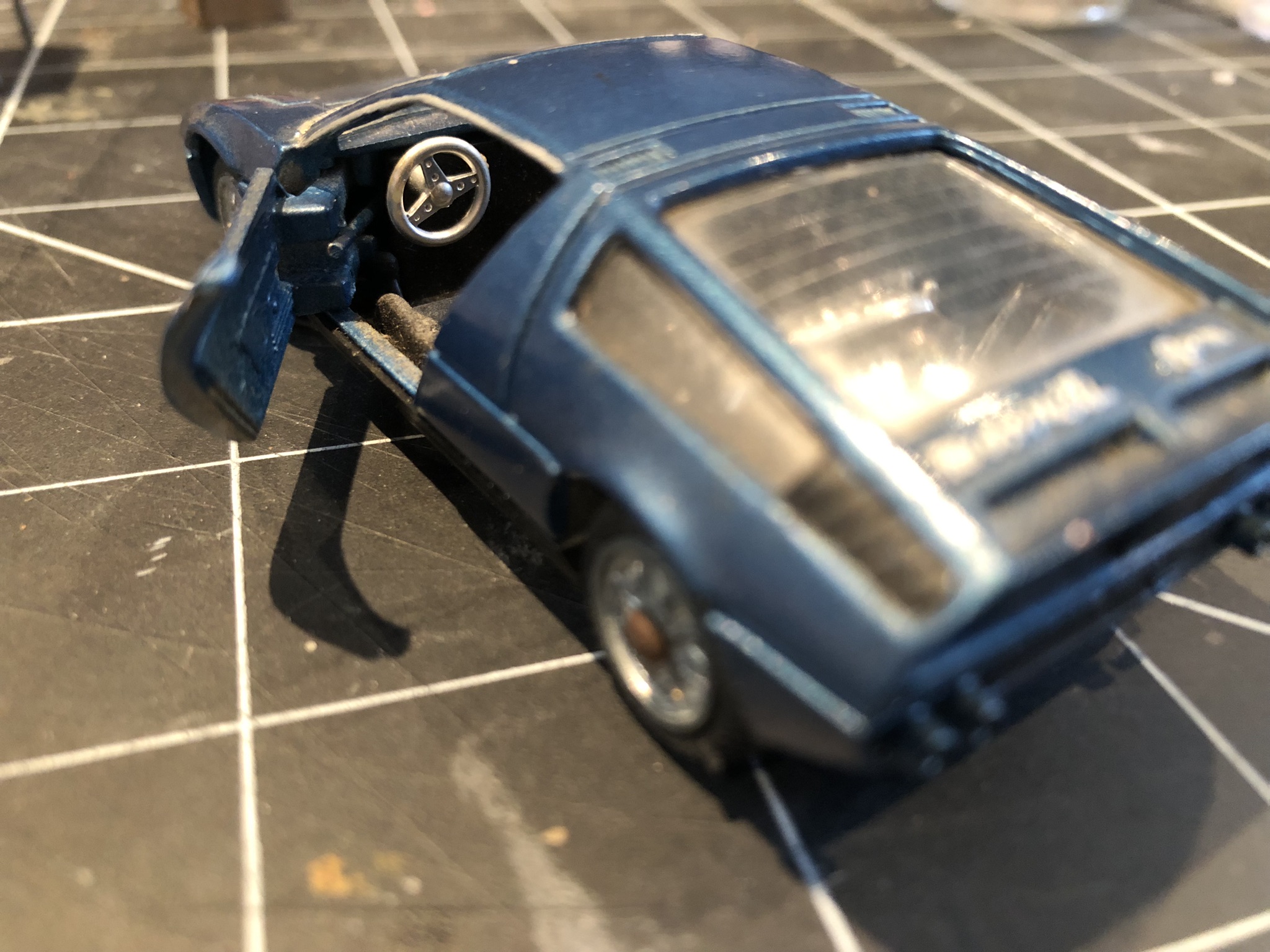 Pour le reste, après nettoyage à la solution vinaigrée ( 20%), je repeinds l'intérieur en beige. Je fais les contre-portes et les sièges en cuir beige. J'adapte un tableau de bord issu de mon stock de pièces détachées. Je modifie et repeinds des roues d'une BORA G&P en statut épave. J'en profite pour adapter feux arrières, calandre et parechocs + un rétro. J'ai customisé aussi l'arrière avec un moteur visible et plus détaillé.