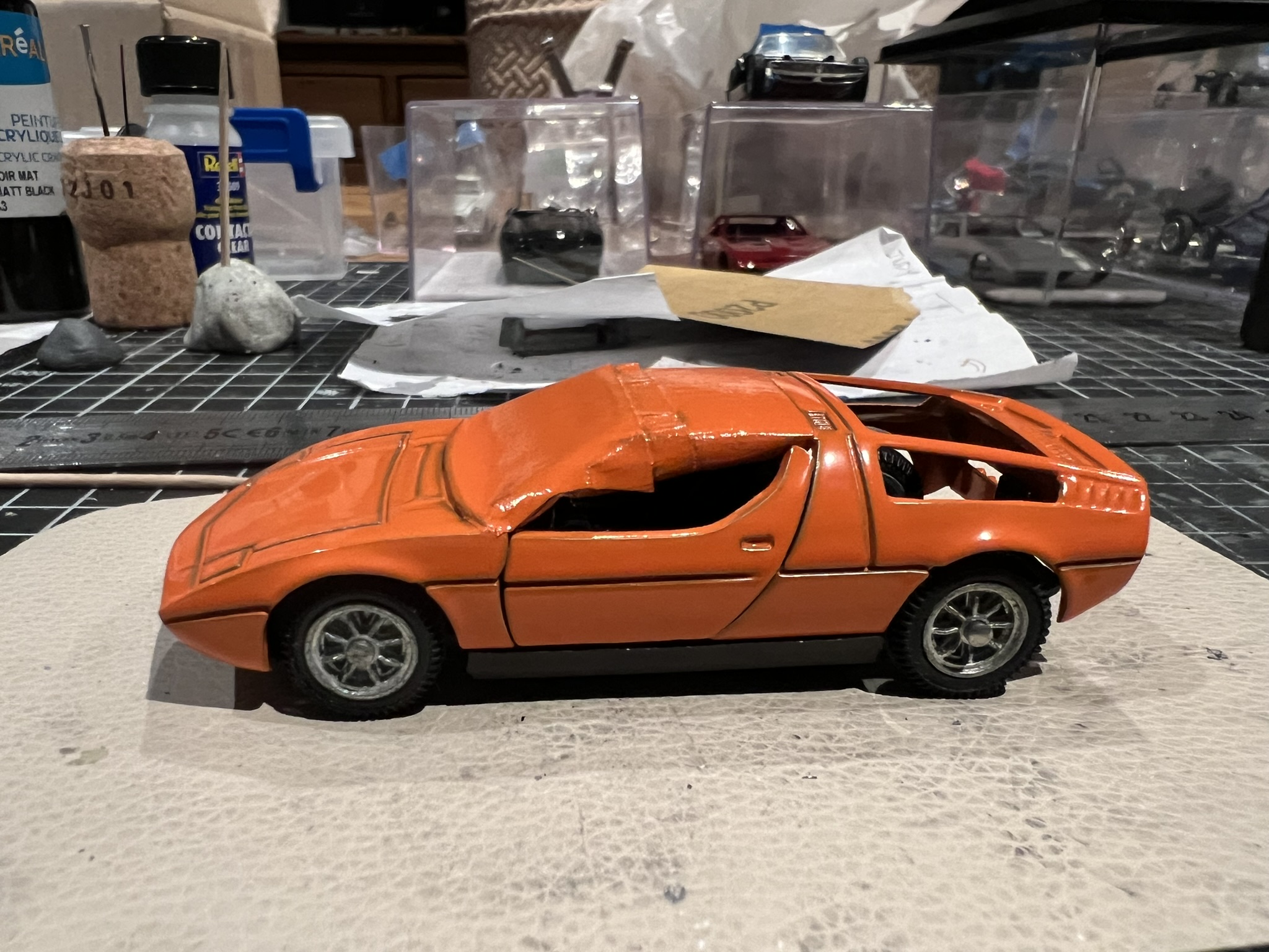 J'ai encore deux épaves d'Indy Solido à réhabiliter. Je penche pour une blanc/cuir naturel et j'hésite pour la dernière entre un gris clair metal (aux reflets bleus) et un orange pétant. A suivre...