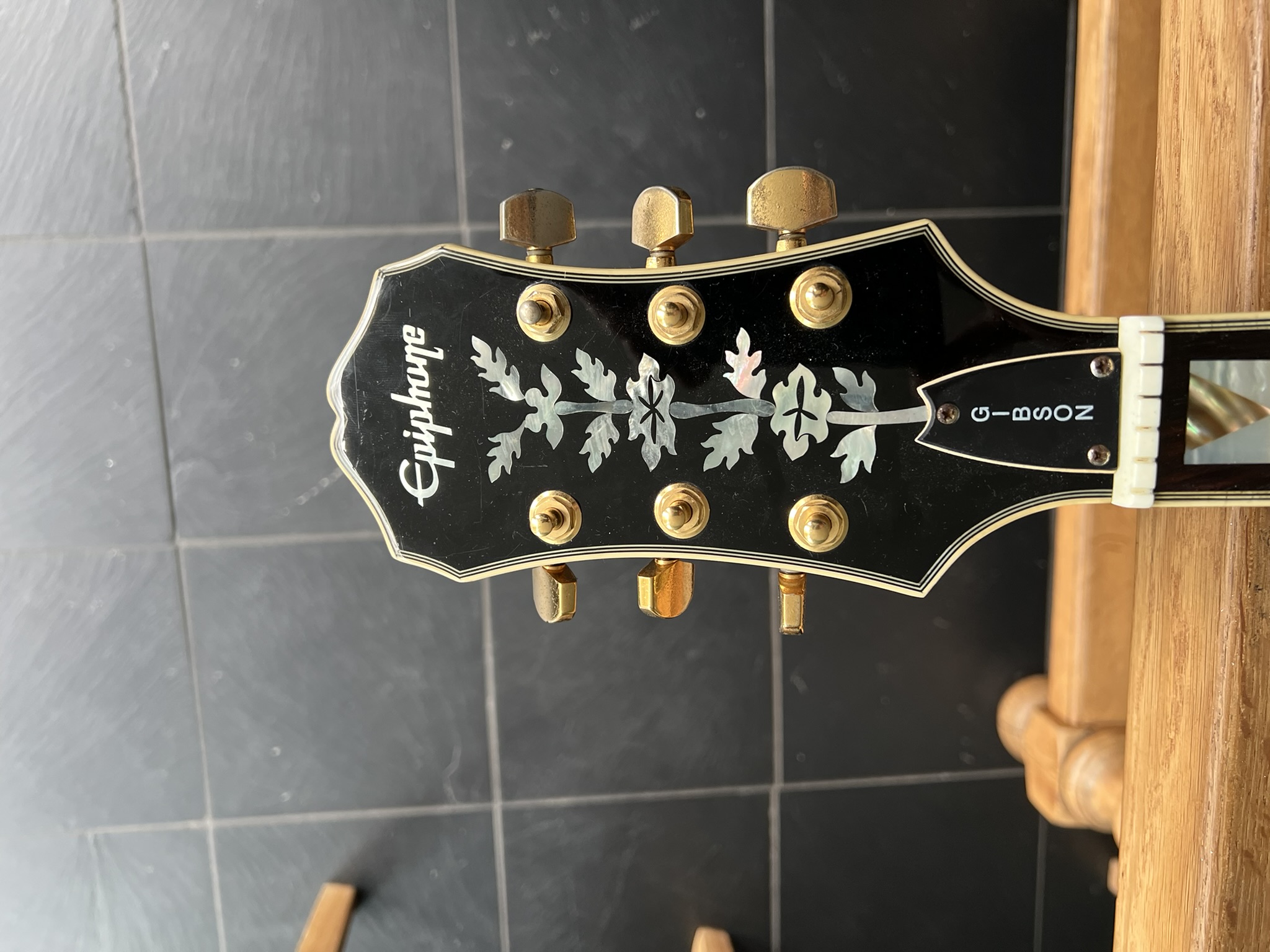Je ne résiste pas à vous présenter ma plus ancienne guitare, fidèle depuis 40 ans ! C'est une Epiphone Sheraton, couleur naturelle. Je l'ai doté de nouvelles mécaniques, d' attache courroie , de boutons. EN attendant une prochaine commande chevalet/cordier. Voici à quoi ça ressemble :