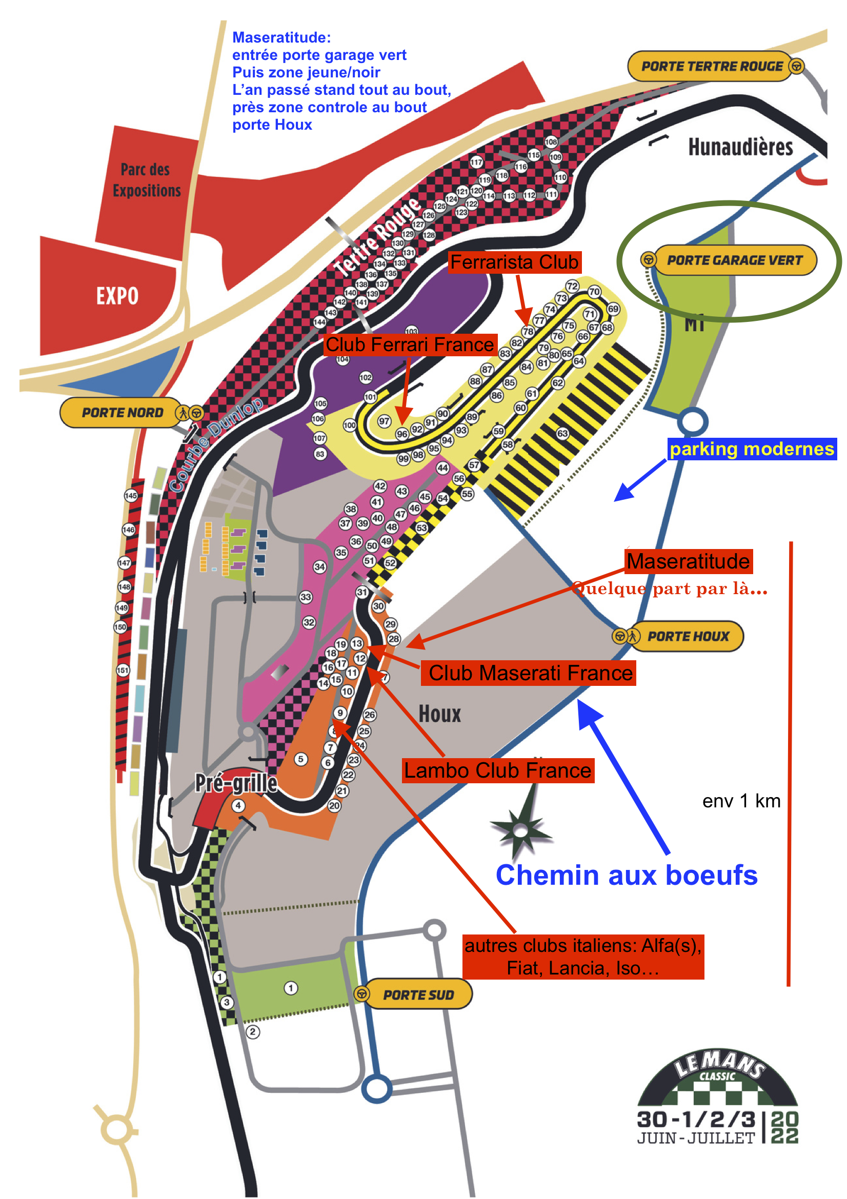 Ci-dessous plan des clubs (2023). Cette année Maseratitude sera probablement à coté des Lambo et du CMF (stands 12 et 13).