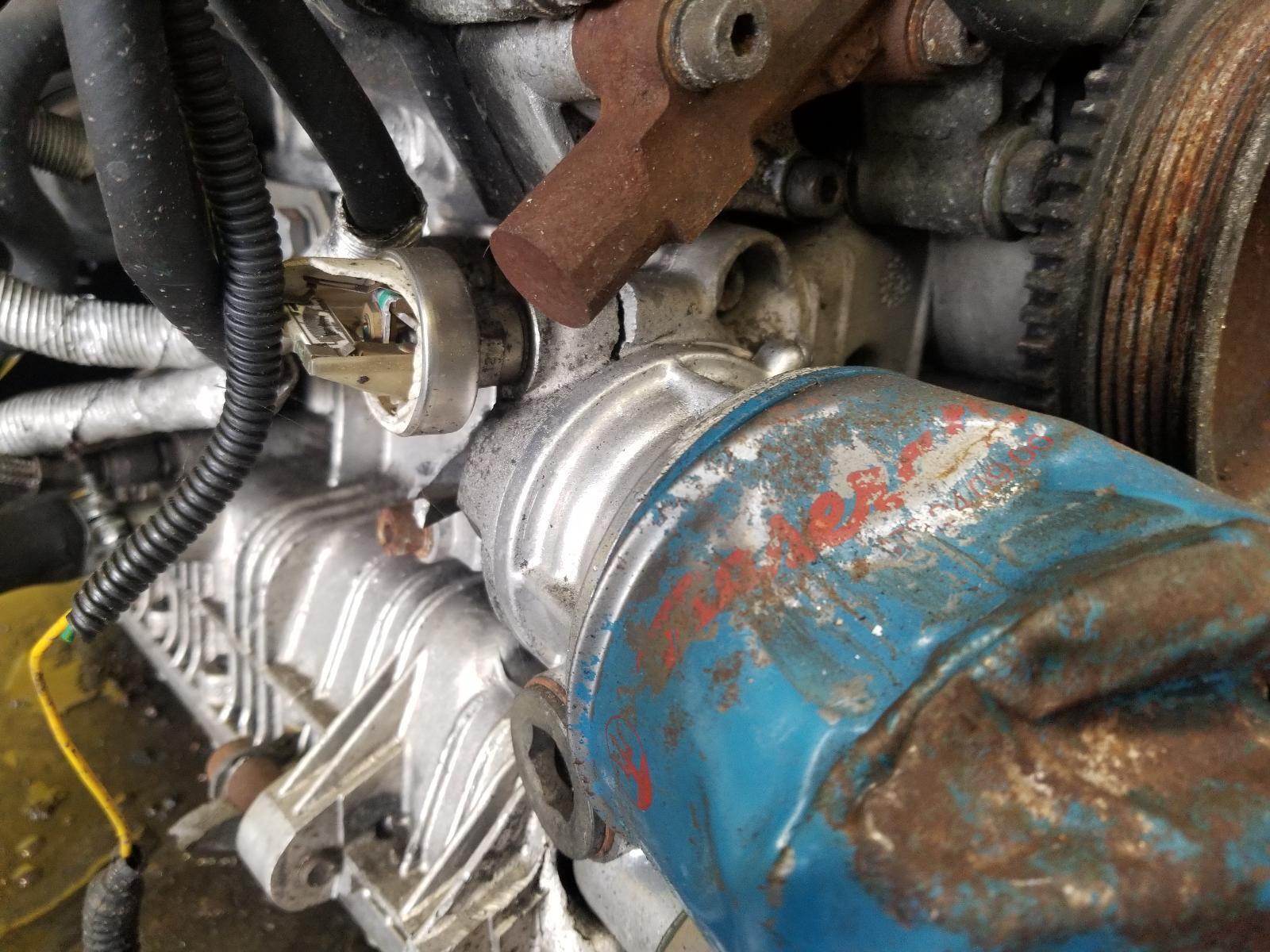Il est probablement possible de restaurer l'attache avant et de ressouder un morceau pour boucher le trou. La pompe à huile, ça se remplace aisément, mais je voudrais garder le bloc d'origine de la jaune.