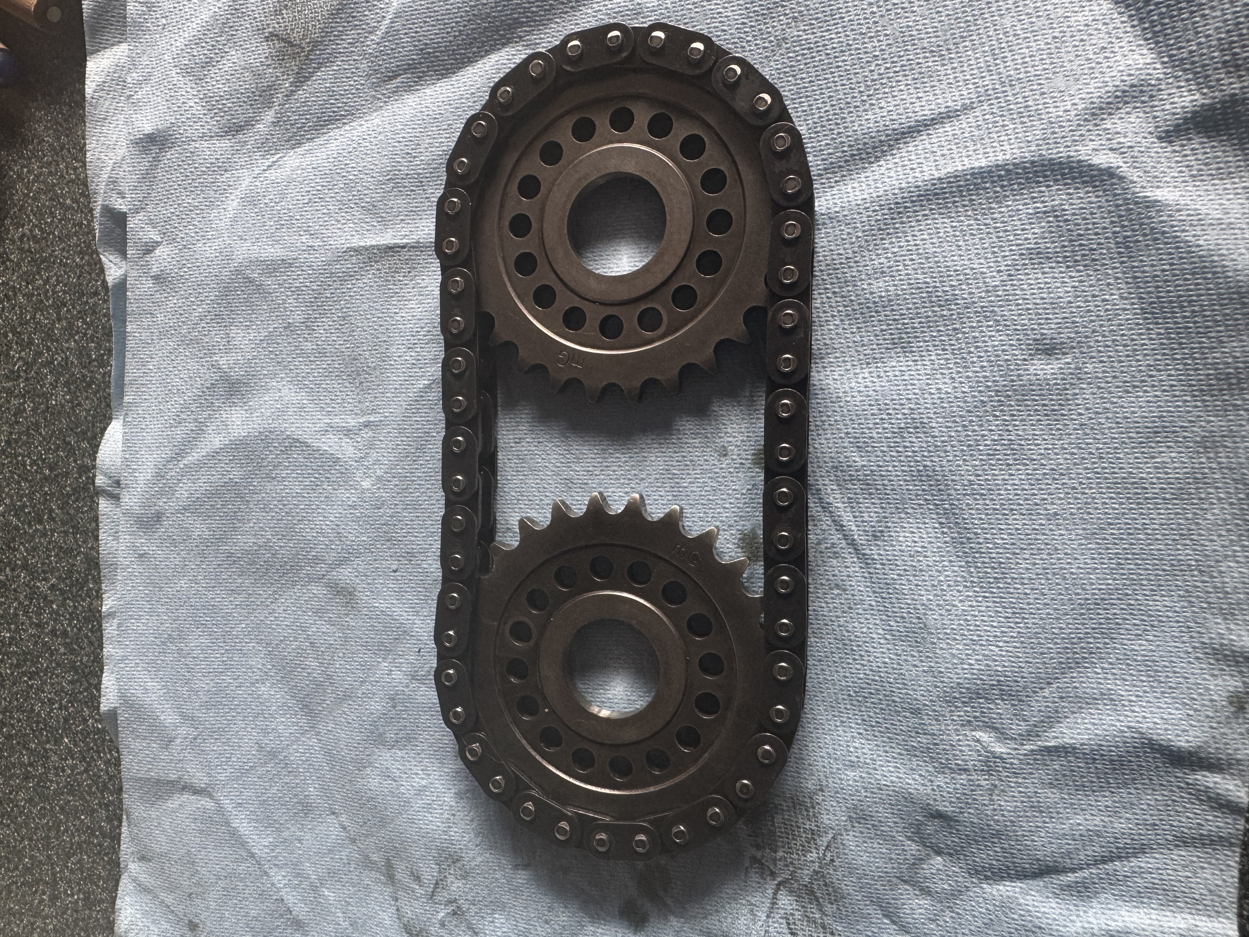 En regardant de près on voit qu'il y a des inscriptions sur la chaine : "MORSE" d'un côté et "ITALY" de l'autre. Il y a aussi inscrit "mG" sur les pignons.
