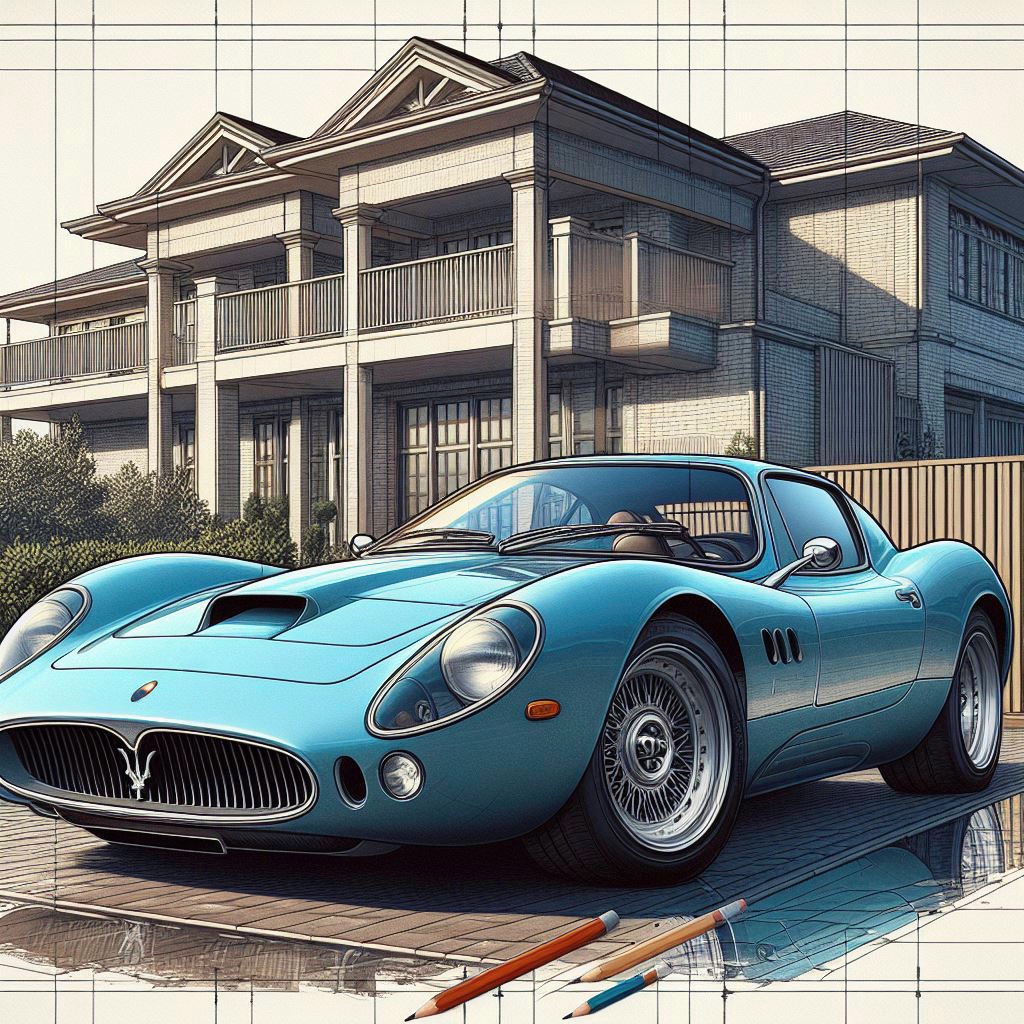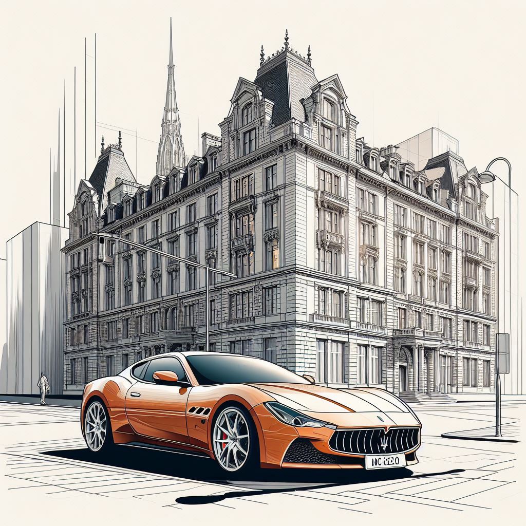 Plus que des mots clés, c'est une description de ce que l'on souhaite, rédigée en langage naturel, qu'il faut faire. Par exemple ici sur la photo avec la voiture orange, je me suis contenté de fournir une image d'un bâtiment dessiné au trait, puis de demander = faire une illustration d'une Maserati garée devant l'immeuble figuré surla photo, pour qu'elle s'intégre dans le dessin dans le même style.
