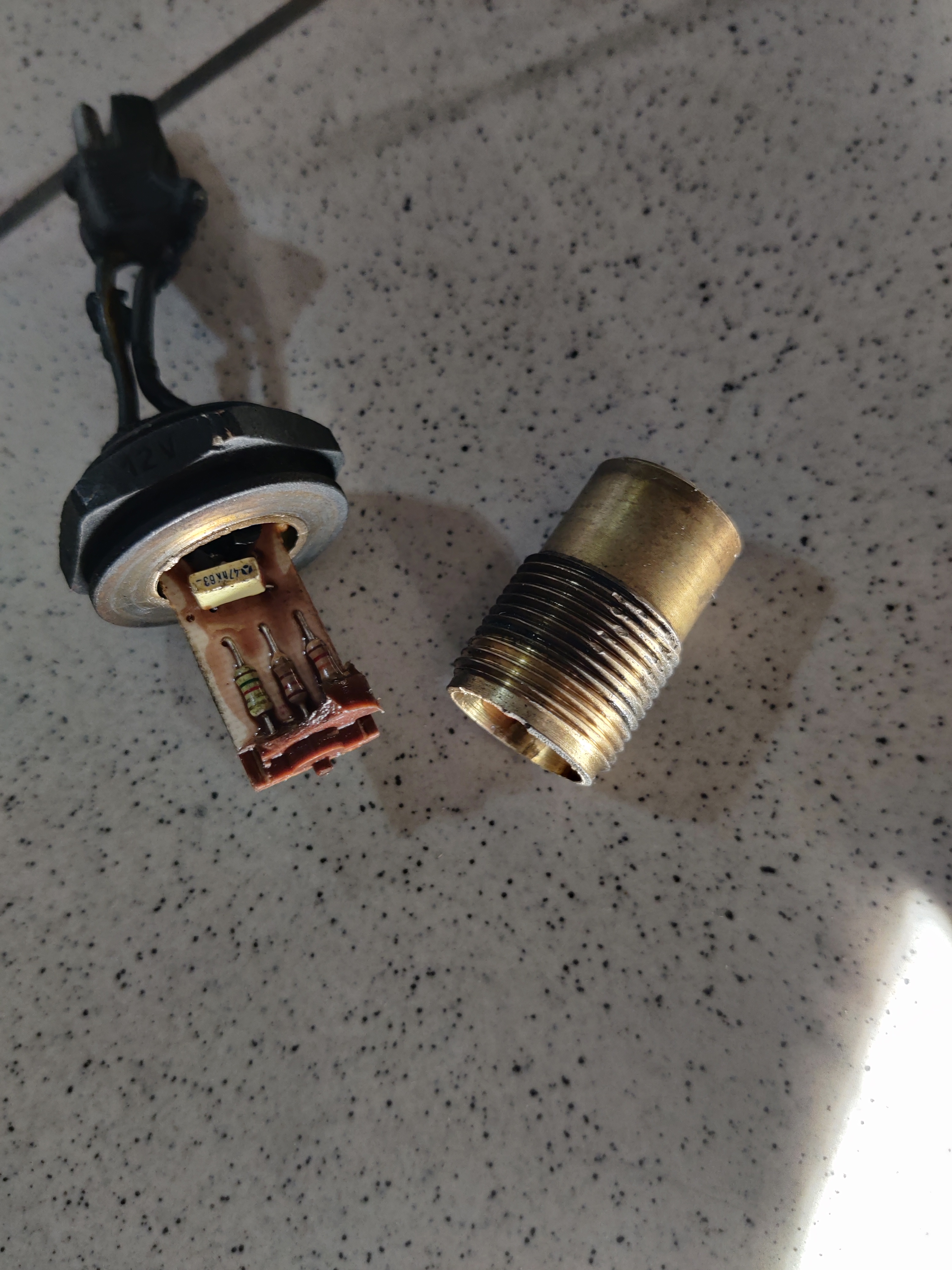 Armé de mon multimètre, je me mets donc en tête de tenter la réparation, mais malheureusement, il est FUBAR. L'extrémité devrait être relié à deux bobines qui seraient dans le capuchon brun, et il n'y a aucun câble qui relie les deux parties, et je ne trouve pas où commence les dites bobines.