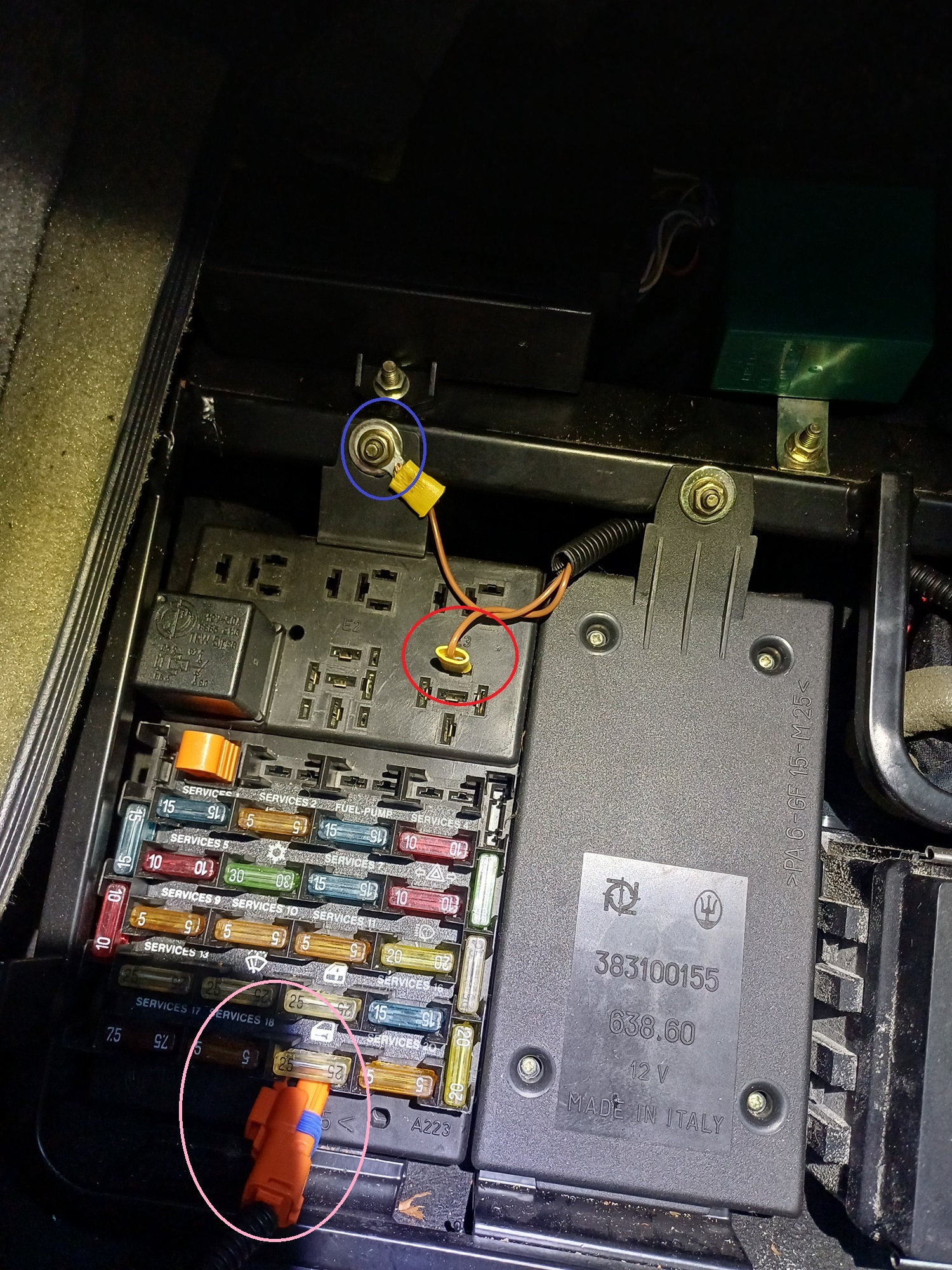 Le tout relié a une prise 2 broches (orange en bas) et on fait pareil sur cote prise 3 broches. L'objectif est d'avoir l'alimentation juste a cote de la prise 3 broches Fiat et d'éviter de démonter la plaque fusible a chaque fois ou d'aller chercher le 12v a la batterie...
