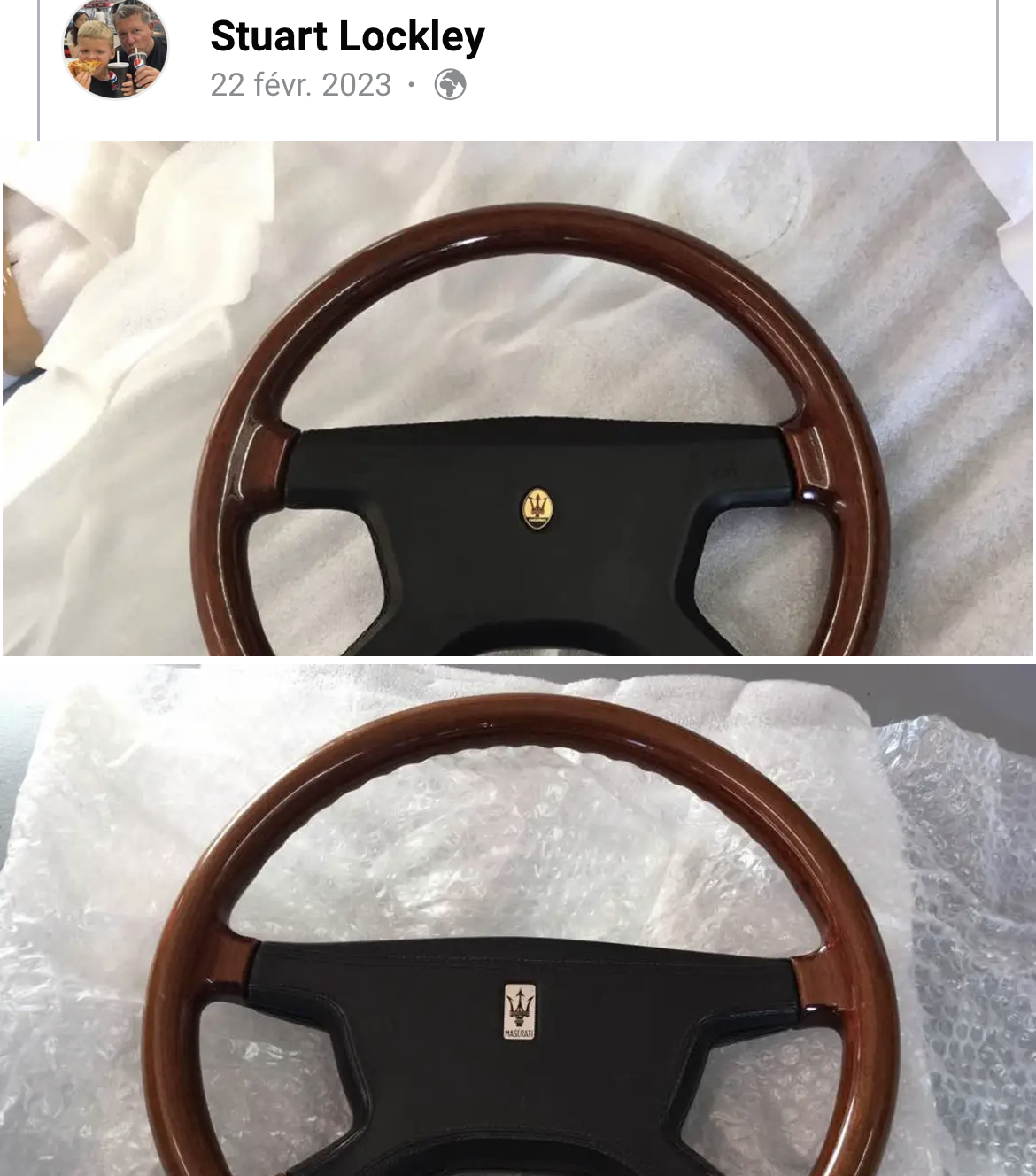 A propos de volant, voici le volant des dernières Biturbo (430, 222SR, 222 4v) et des Ghibli non ABS en bas avec en logo le dessin du trident par Mario Maserati en 1926, et au haut le logo ovale et plus discret à partir de la Ghibli ABS model year 94 :