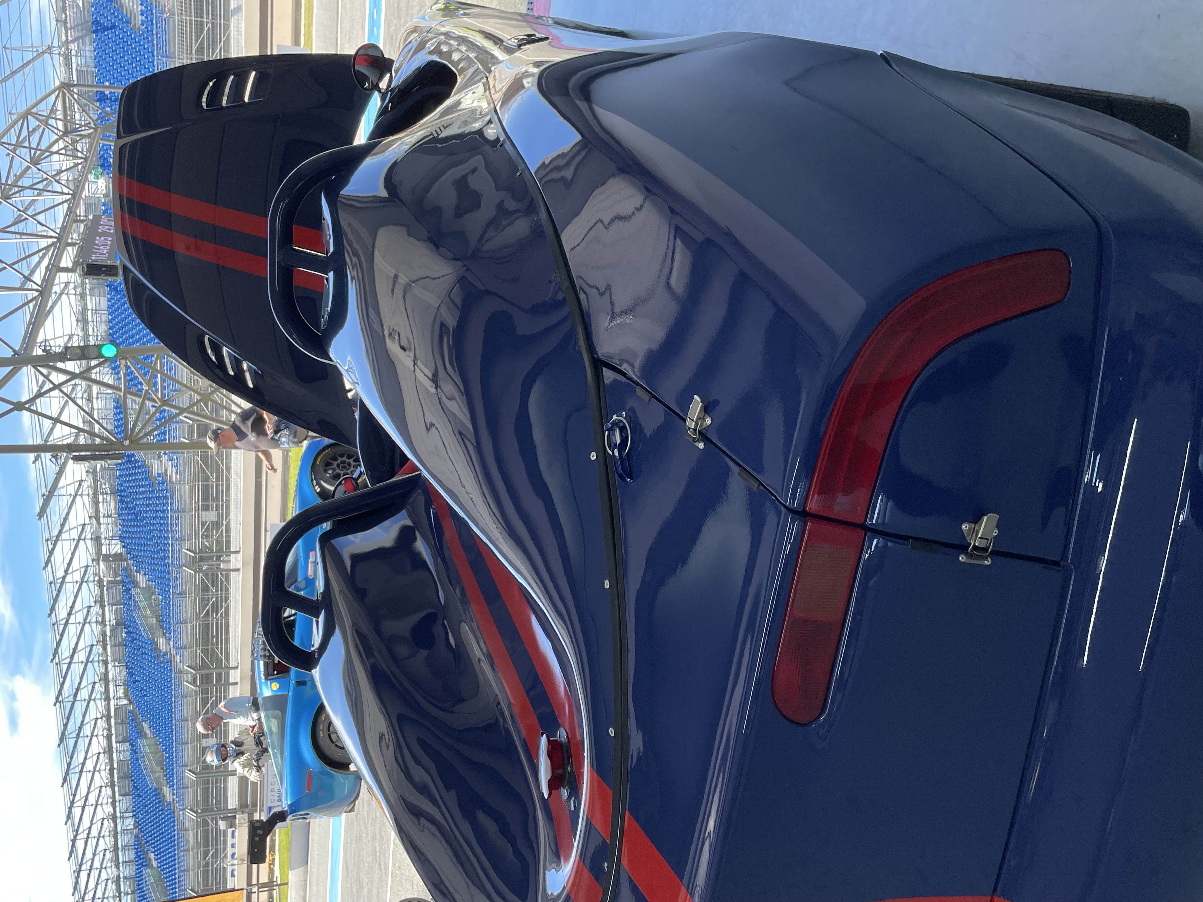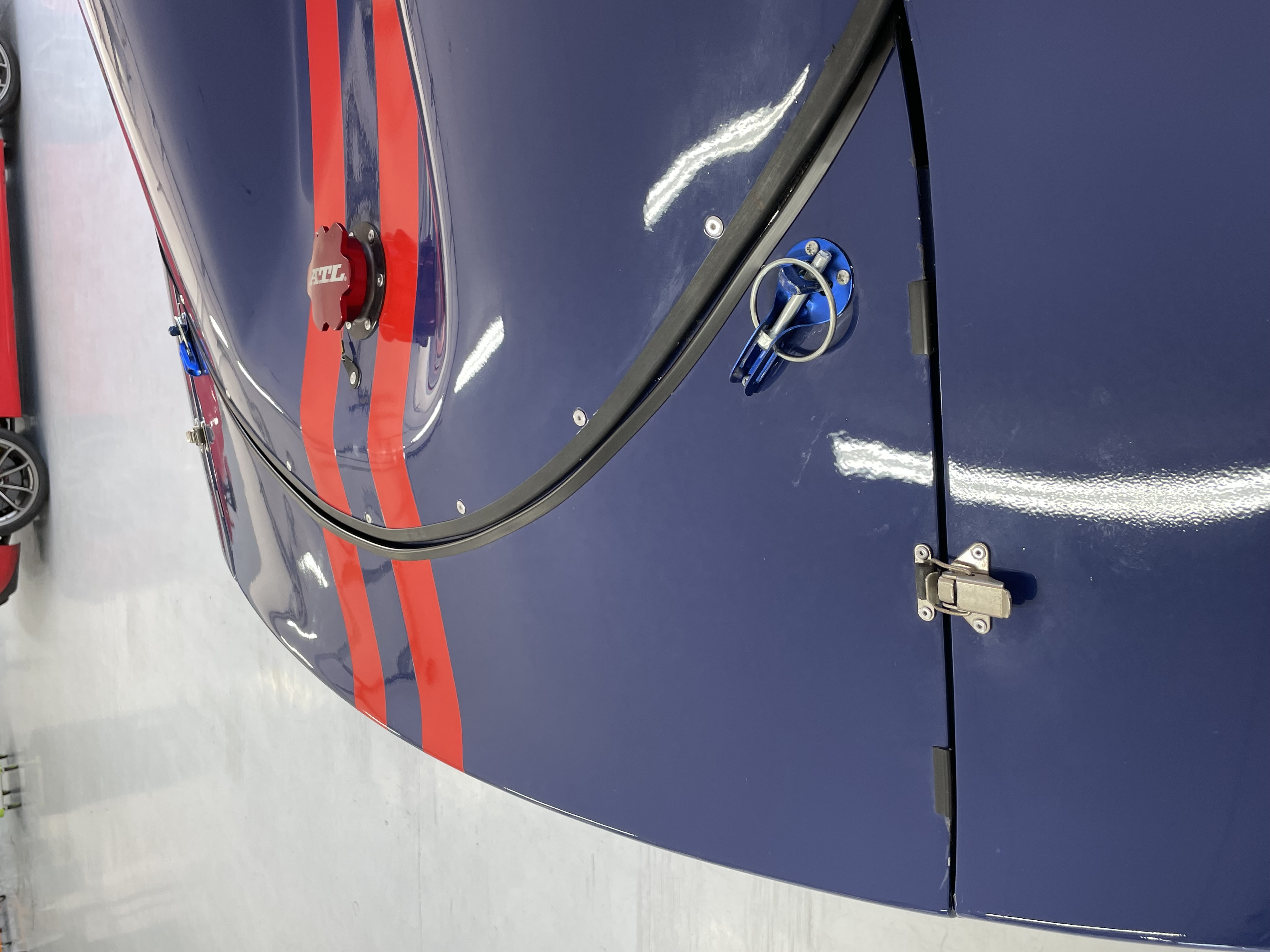 la carrosserie avec ses bandes rouges court de l'avant à l'arrière :