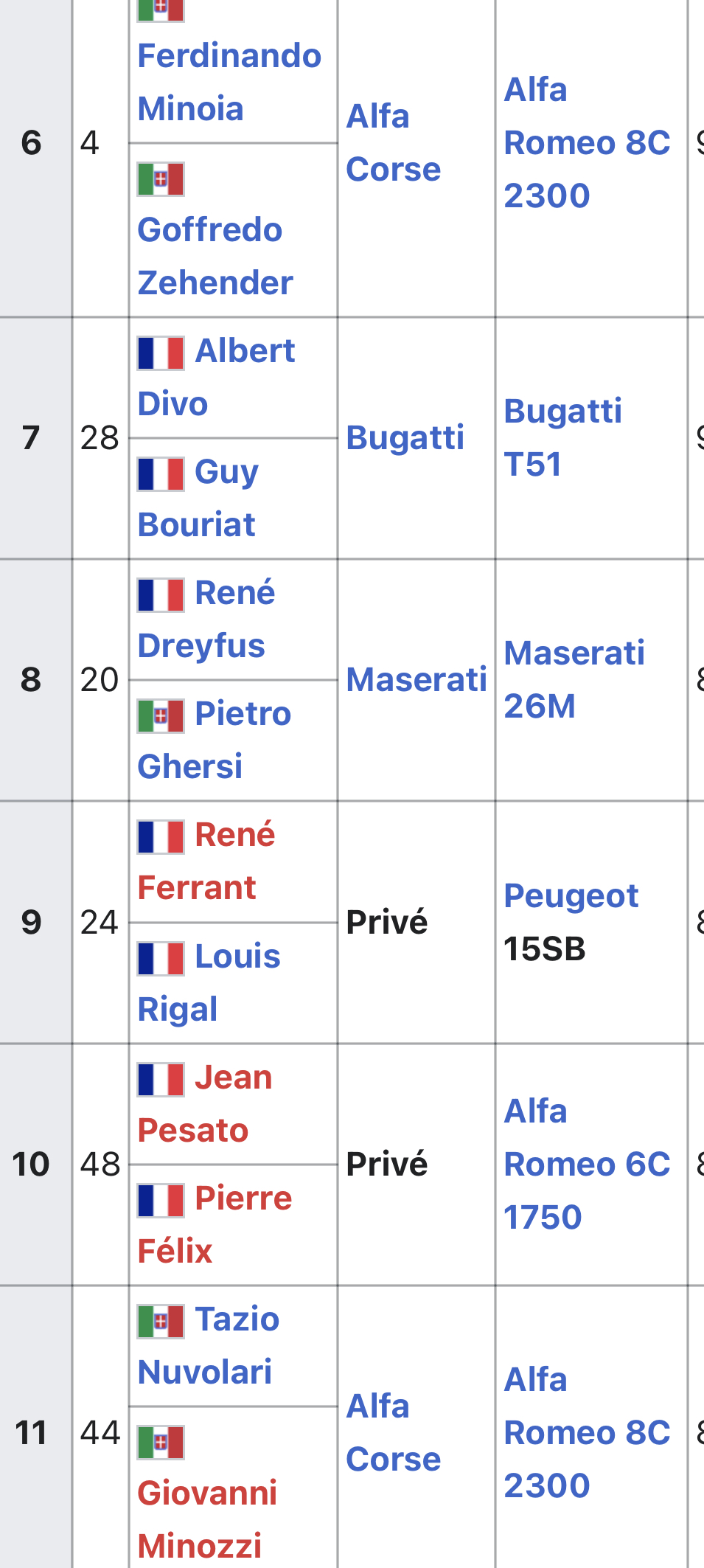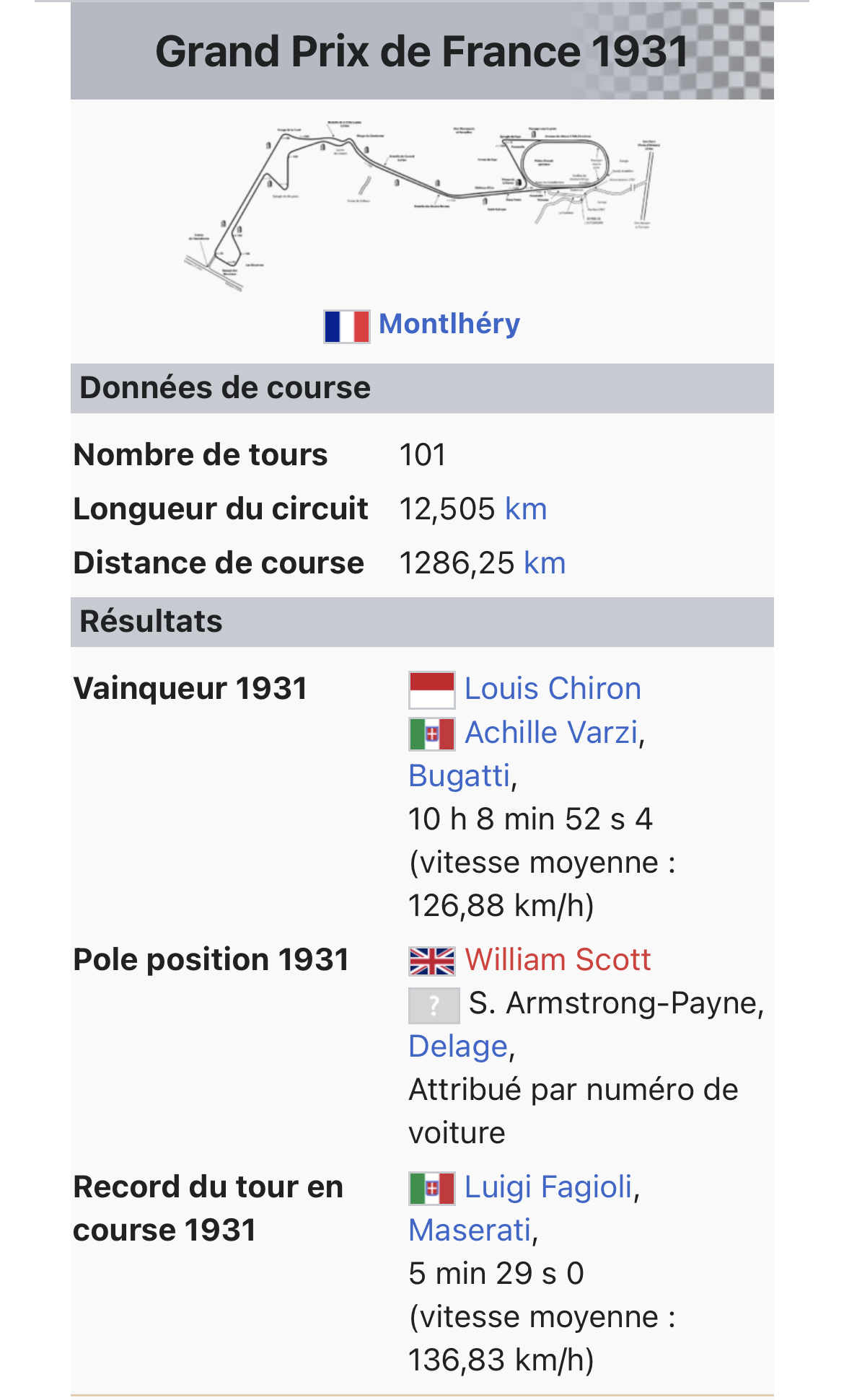 Le grand prix de France 1931 s’est tenu à Montlhéry et alentours et a duré plus de 10h avec deux pilotes qui se relayaient par voiture.