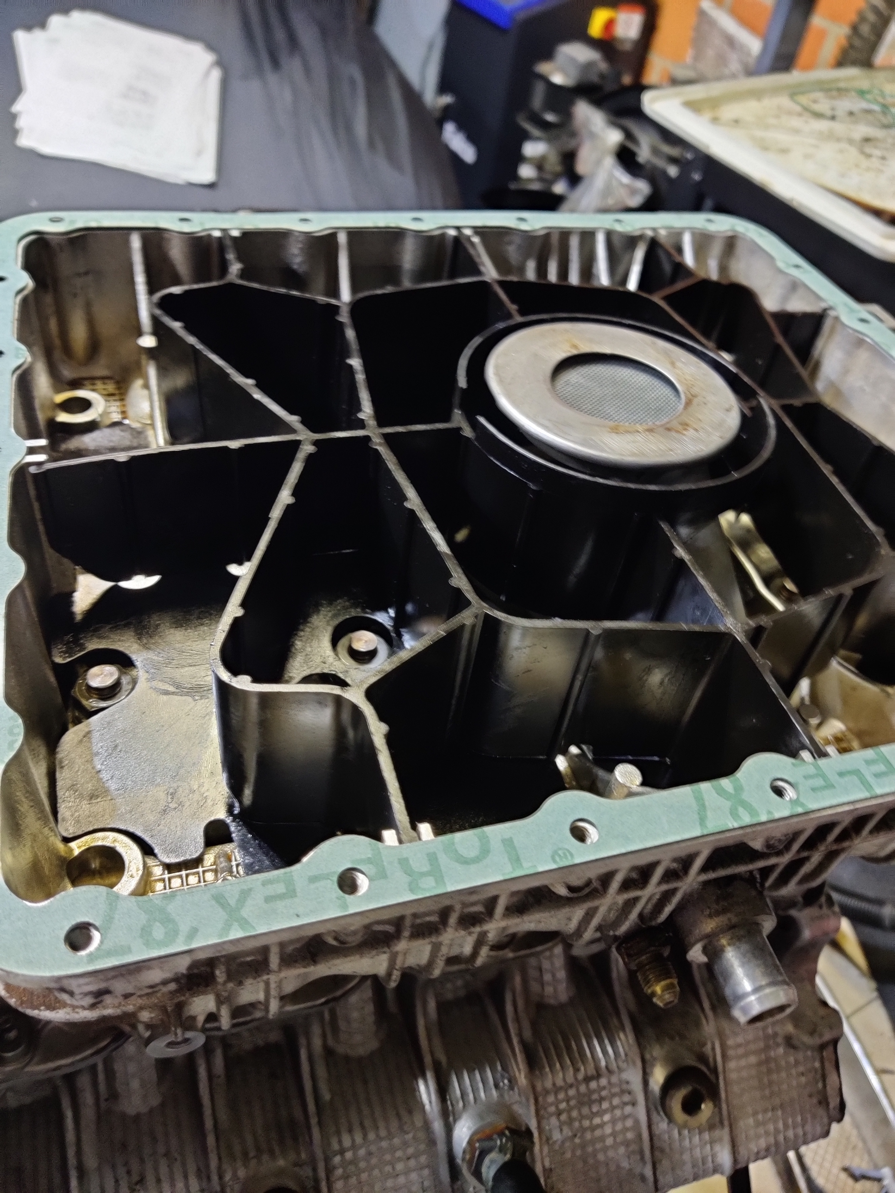MIse en place de la pipe de succion d'huile avec son nouveau joint (j'ai plein de joints, faut que je les utilise. Je ne remercie pas maserati d'ailleurs, tout est en vrac dans la boite, débrouille toi pour trouver quoi va où).