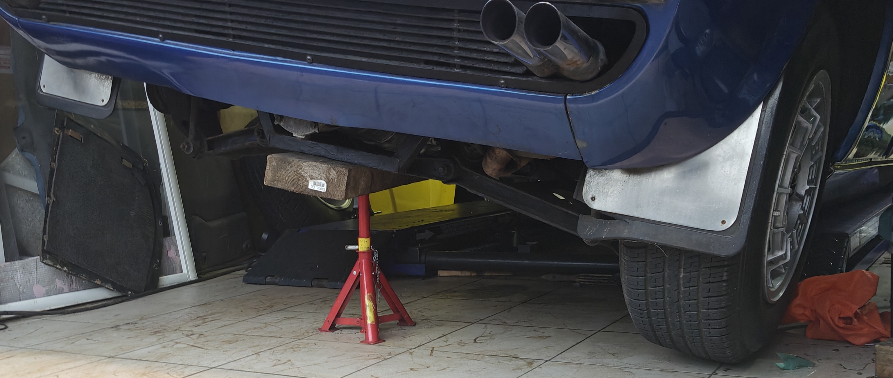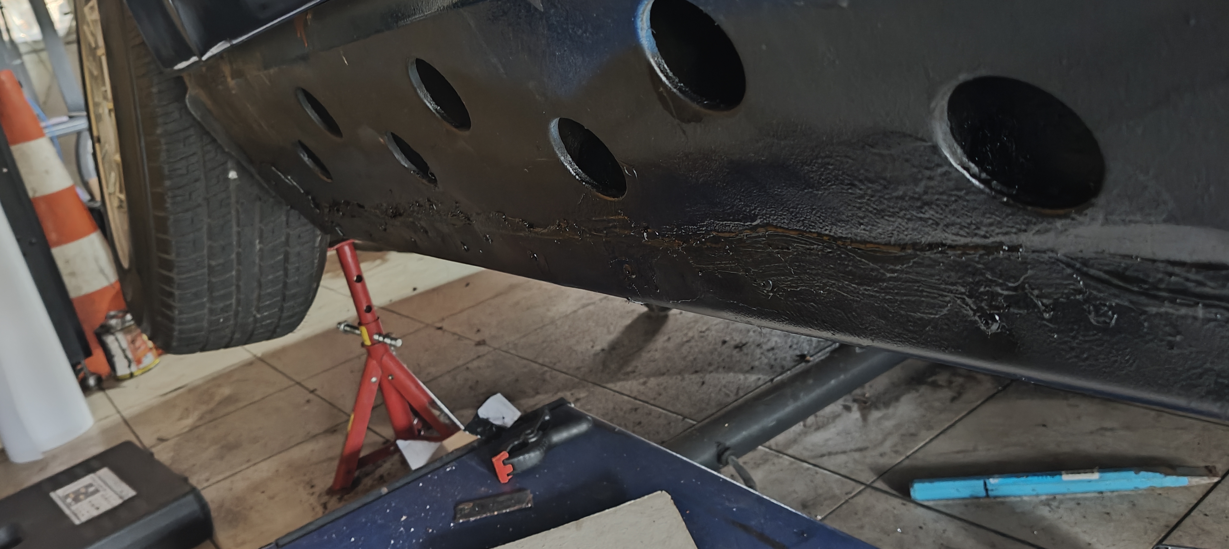 Le cric est là pour maintenir en place en attendant que je fixe, pareil pour les grosses vis dans la traverse, ça permet de bien positionner et travailler à l'aise. Ne faite pas attention au joint qui déborde de partout, il faut encore que je nettoie et ponce ce qui est en trop (oui, c'est ponçable)