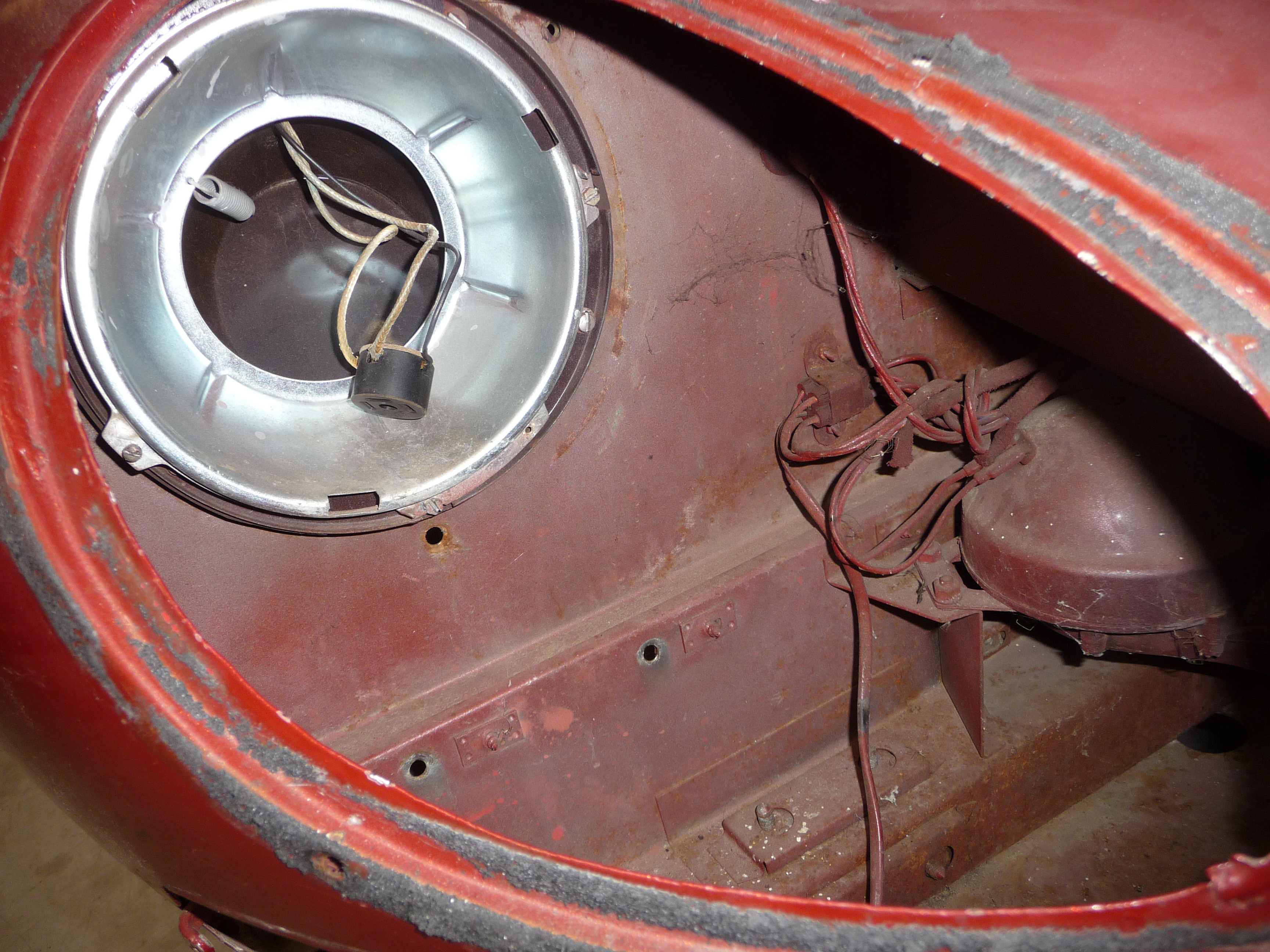 Voici par exemple, à travers l'orifice du phare côté conducteur, l'état bien meilleur que ce que j'espérais, du caisson abritant l'écope de phare, les arrivées électriques et le klaxon gauche: