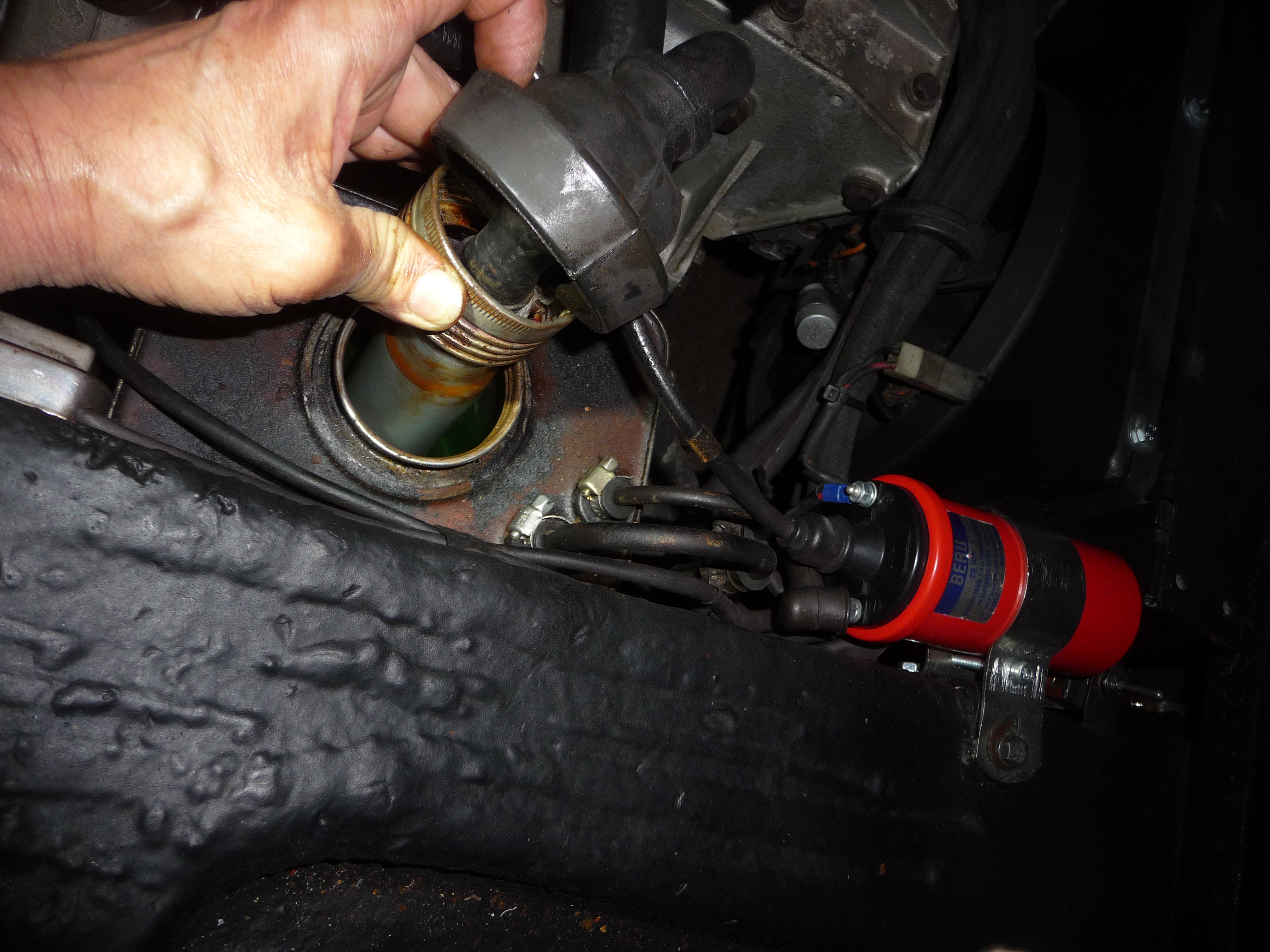 On voit ici le petit tuyau latéral transparent qui permet de vérifier le niveau de LHM vert: