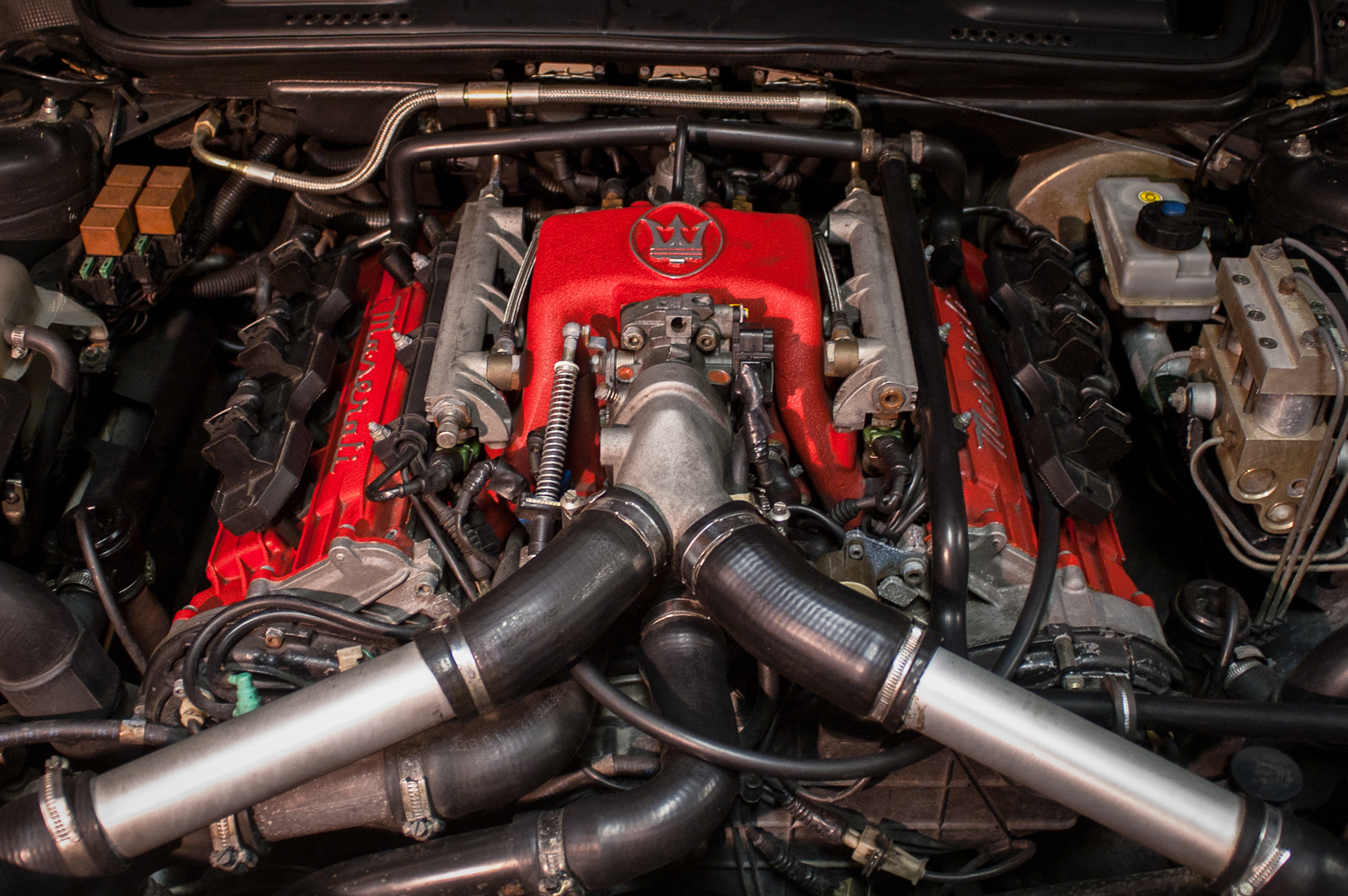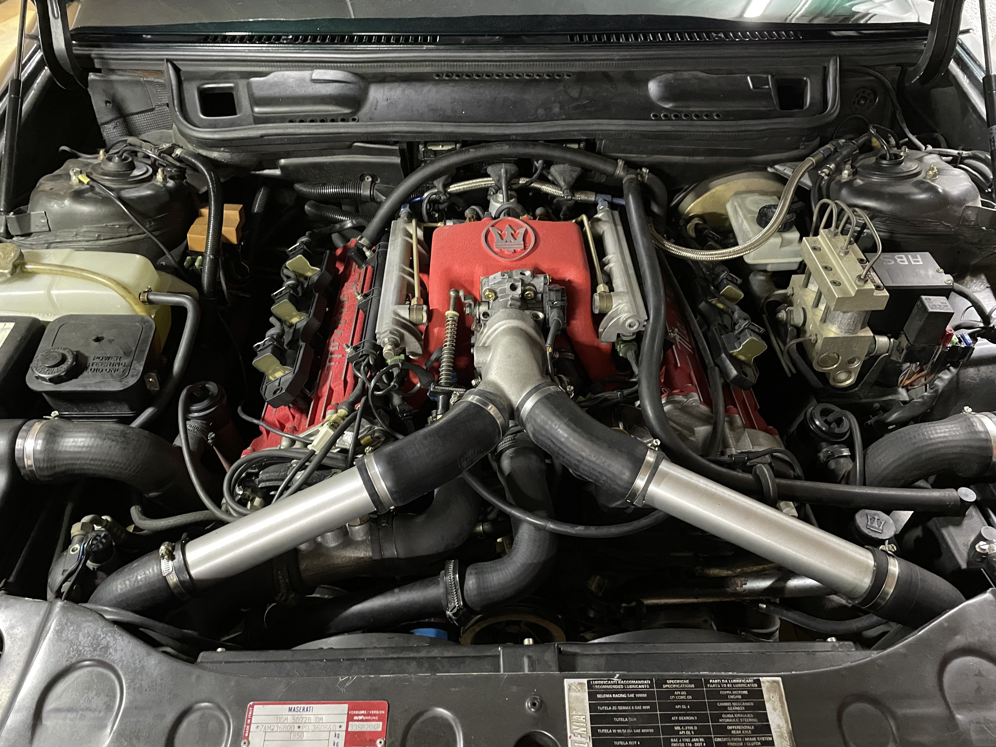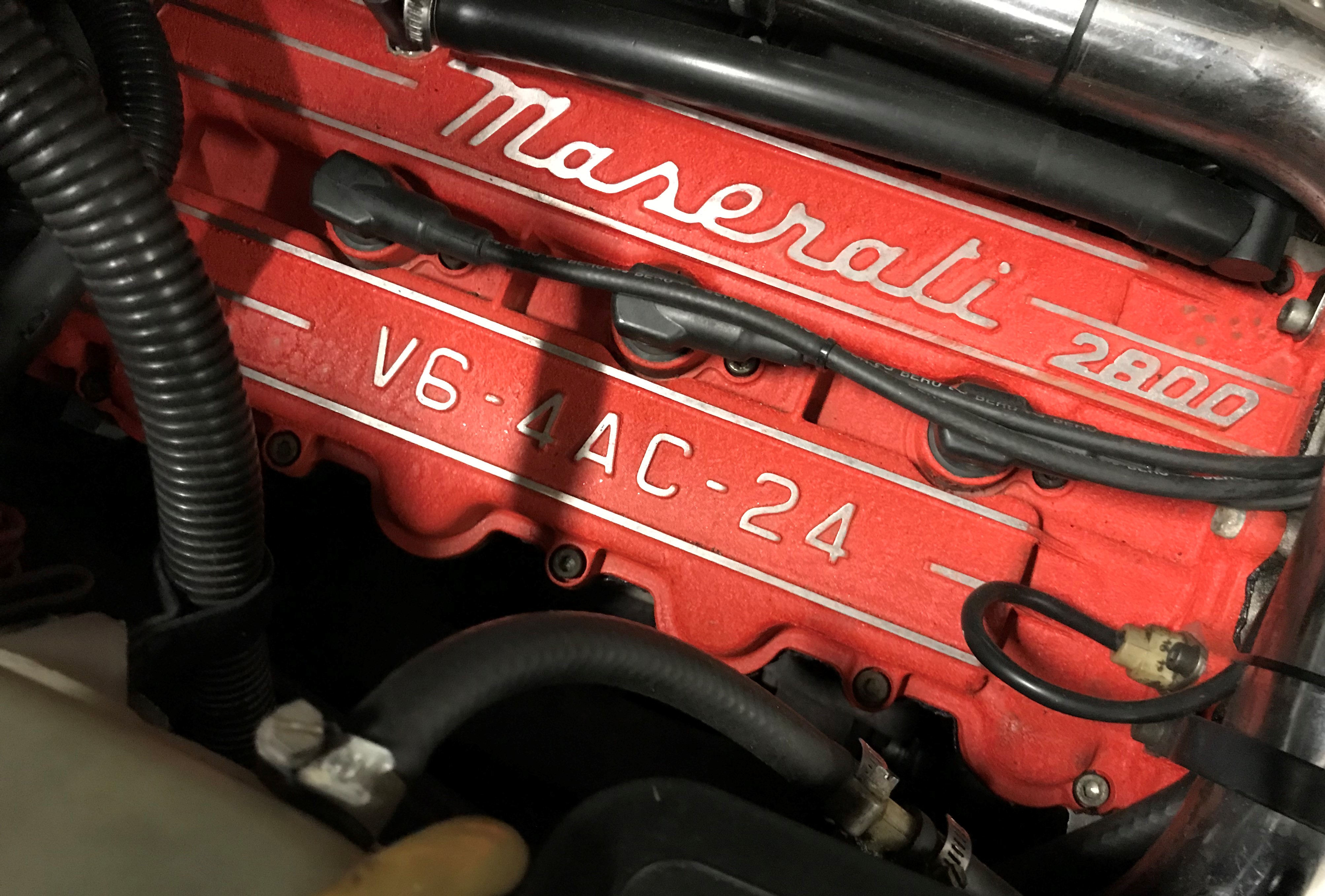 Sur la droite de la photo, on repère l'ABS qui est installé pour la première fois sur la Ghibli MY94. Sur toutes les MY94, même 2.8 litres, l'allumage est désormais statique, remplaçant le distributeur mécanique Delco, et on a les filtres à air sur les côtés dans les deux cylindrées. On remarque que l’arrivée d’essence se fait côté conducteur. Seules les GT auront l’arrivée d’essence côté passager ce qui permet d’indentifier une vraie GT, capot ouvert.