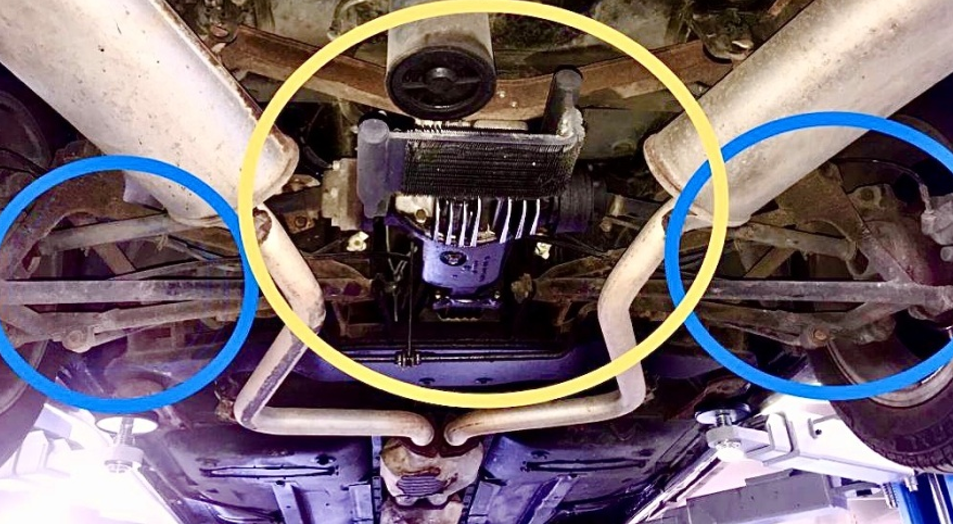 À l'arrière de la MY94, toujours le différentiel Ranger (cerclé de jaune sur la photo de Maseralfa) mais avec une ébauche d'éléments tubulaires (cerclés de bleu) qui apparut sur les "Model Year 94" puis fut largement complétée en cadre vers l'arrière et généralisée sur les Quattroporte IV et les Ghibli GT.