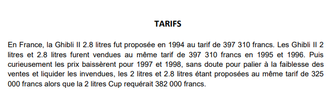 Ghibli Open Cup : V6 2 litres 320 cv en 1995, 330 cv en 1996 différentiel ZF sur gros châssis tubulaire arrière 270/280 km/h 25 exemplaires en 1995 et 1996