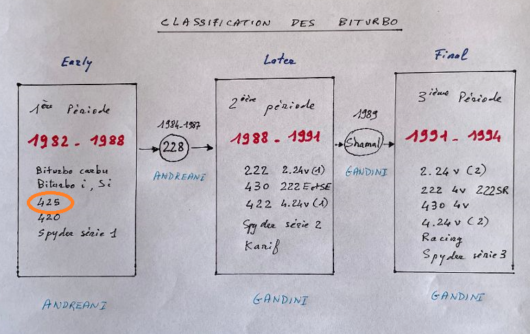 La 425 appartient à la première génération des Biturbo et pour cause : elle fut la toute première des berlines Biturbo et Pierangelo Andreani avait commencé à travailler sur elle dès 1981, avant même la présentation du coupé Biturbo le 14 décembre 1981.