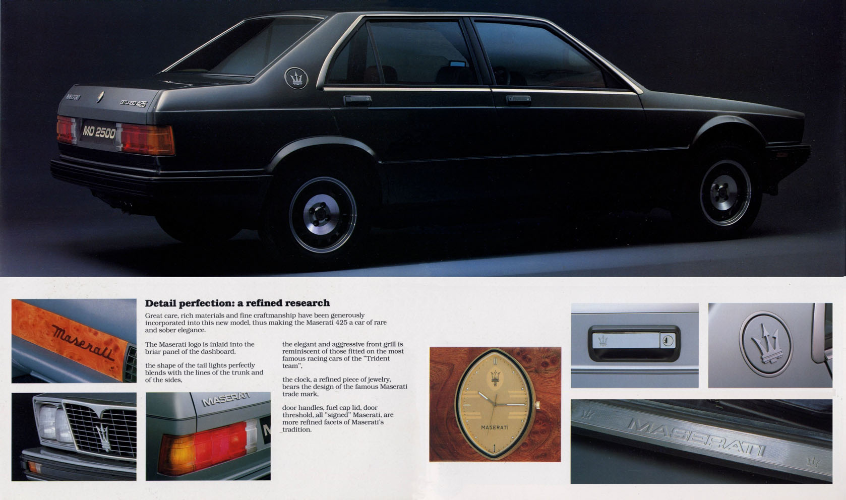 La 425 inaugure le tableau de bord arrondi et la montre ovale Bouchet-Lassale, dorée et tournée légèrement vers le pilote. Le tableau de bord arrondi va se retrouver sur les Biturbo jusqu'à la Ghibli II et la Quattroporte IV avec un graphisme un petit peu différent et la montre suisse Lassale va devenir un très grand classique Maserati, puisque la forme ovale des montres reste encore présente en 2021.