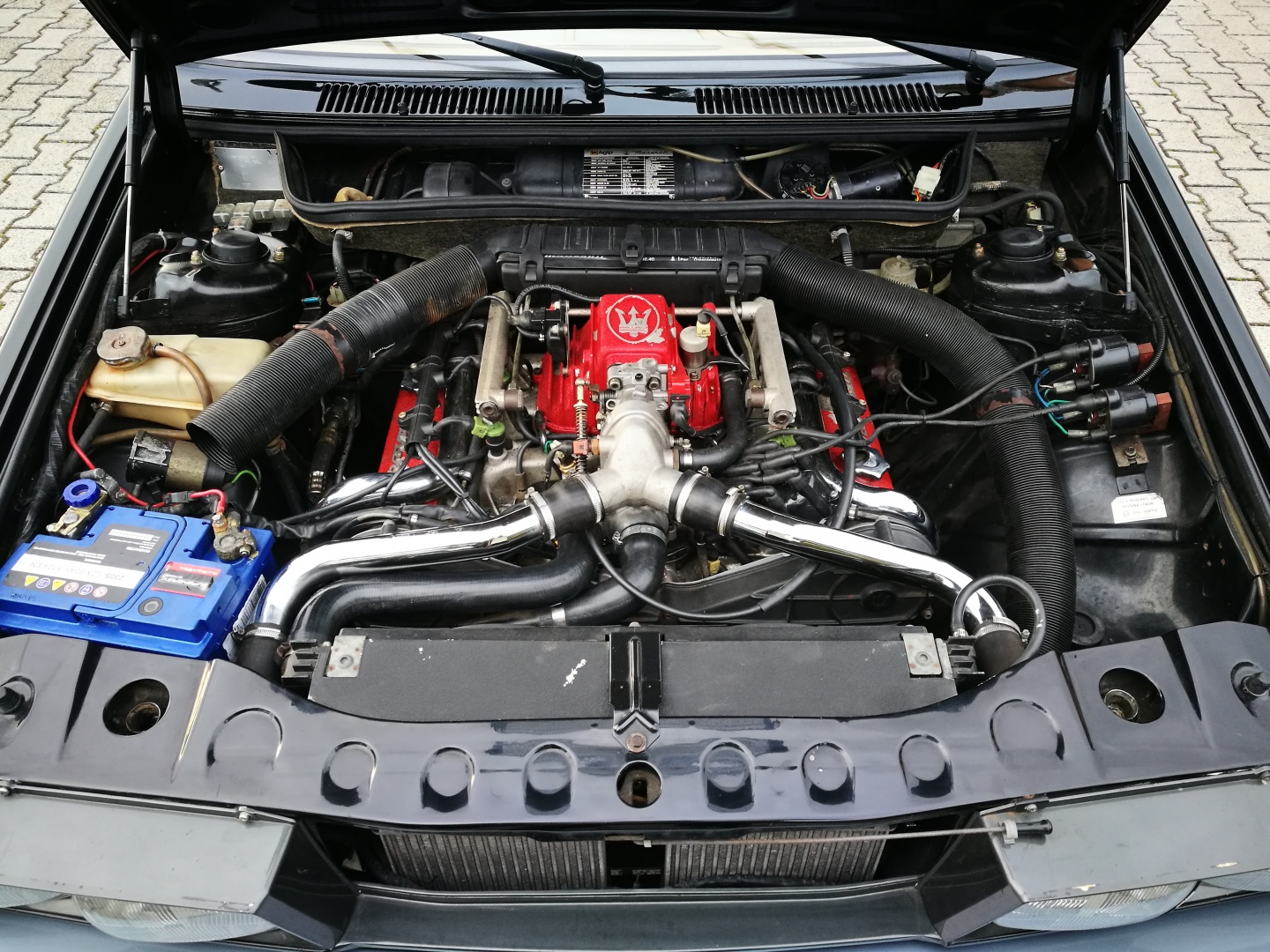 ci-dessous un coupé Biturbo de présérie avec un seul boudin amenant l'air au filtre et un vase d'expansion différent de la série.