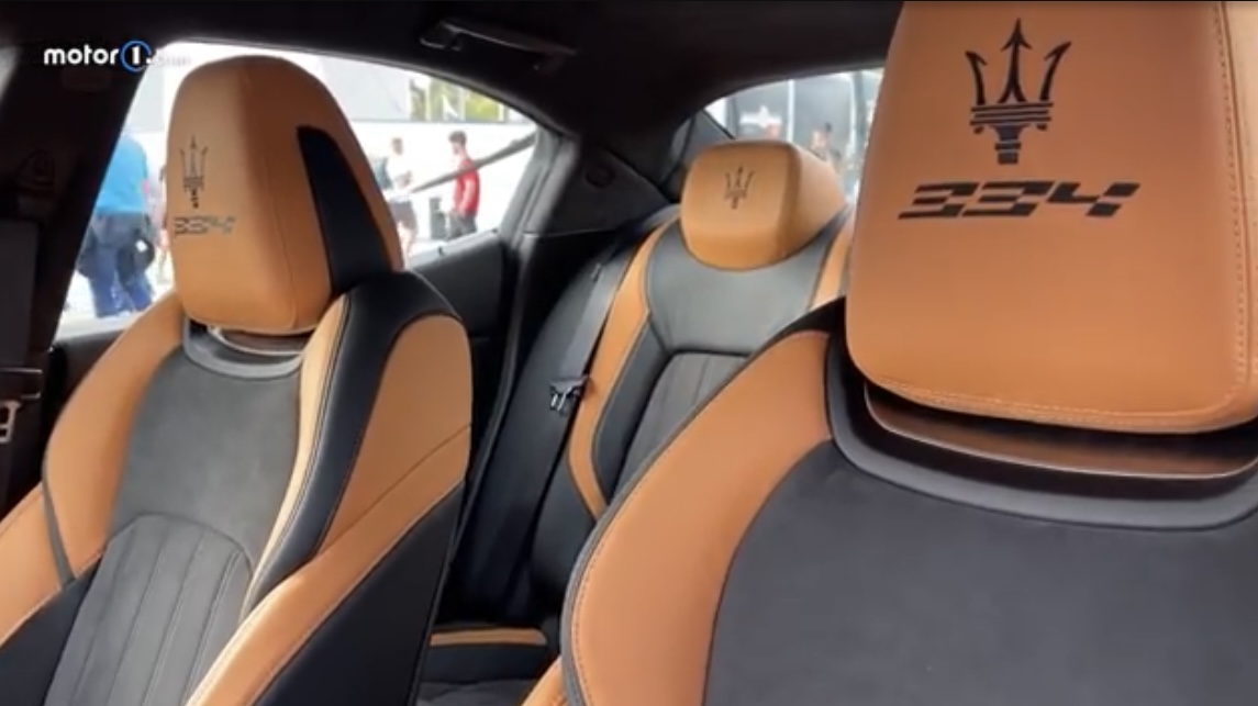 Le tour des sièges et les appuis têtes sont en cuir orangé "terracotta" avec le trident et la vitesse 334 inscrits. Assise et dossiers en Alcantara noir anti glissement :