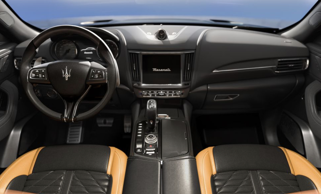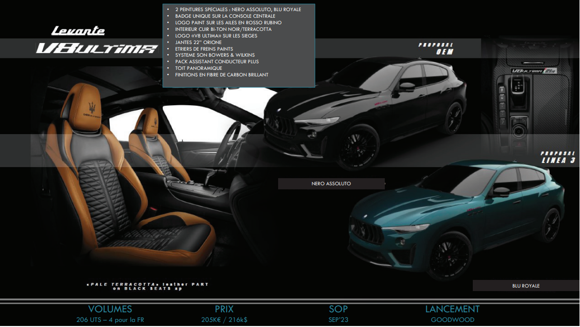 La Levante Ultima peut recevoir une peinture Nero assoluto ou Blu Royale ou (peut-être aussi, je n'en suis pas certain) le Blu Scià di Persia. L’intérieur est assez proche de la Ghibli Ultima sauf la présence de cuir sur les assises et dossiers et bien sûr pas d’inscription 334 mais V8 Ultima sur les appuis tête :