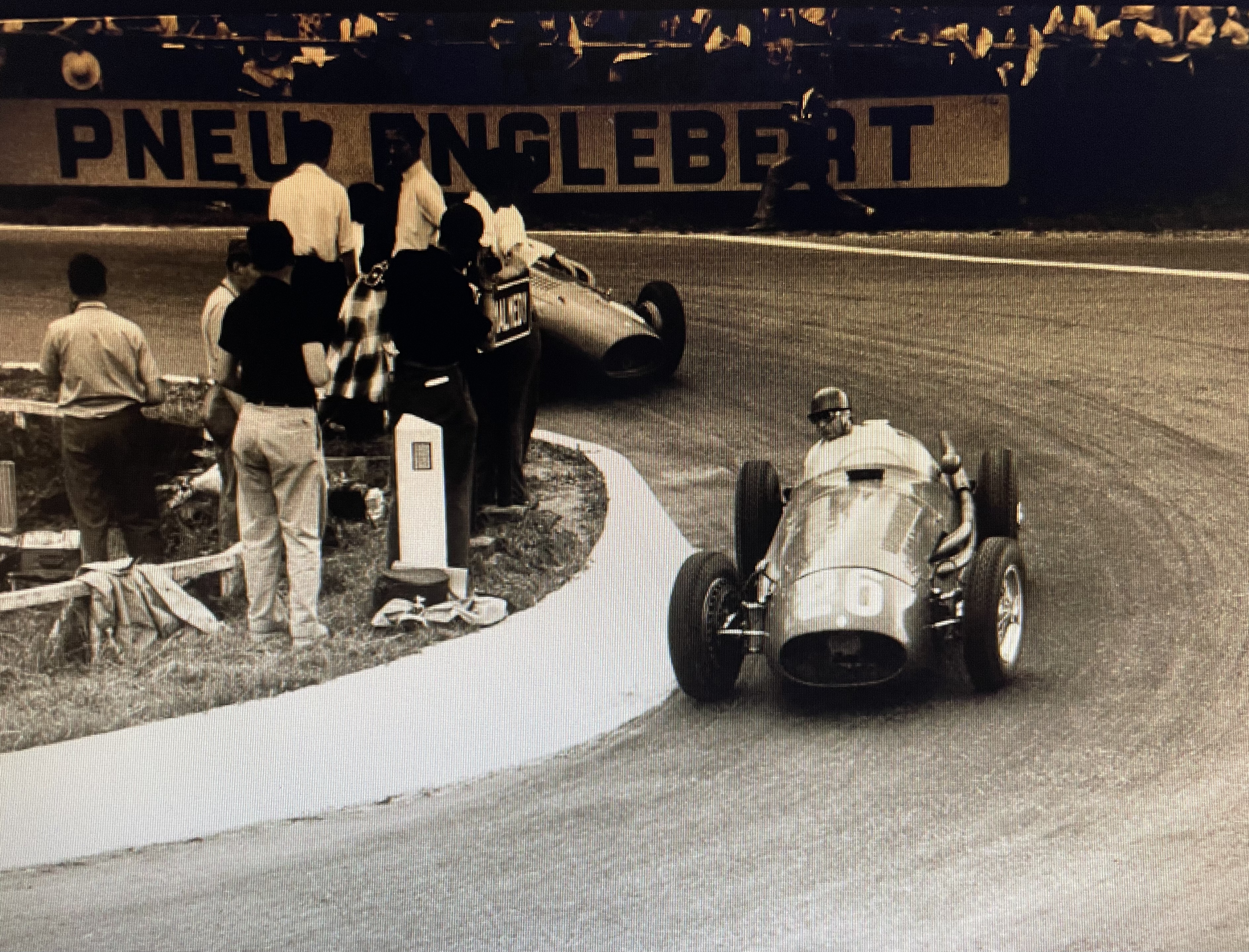 Voyant que l’orage était bien installé pour un long moment, Fangio s’arrêta pour placer des pneus à rainures plus profondes évacuant mieux l’eau et pour mettre un casque à visière moins gênant sous la pluie que les lunettes « aviateur » :
